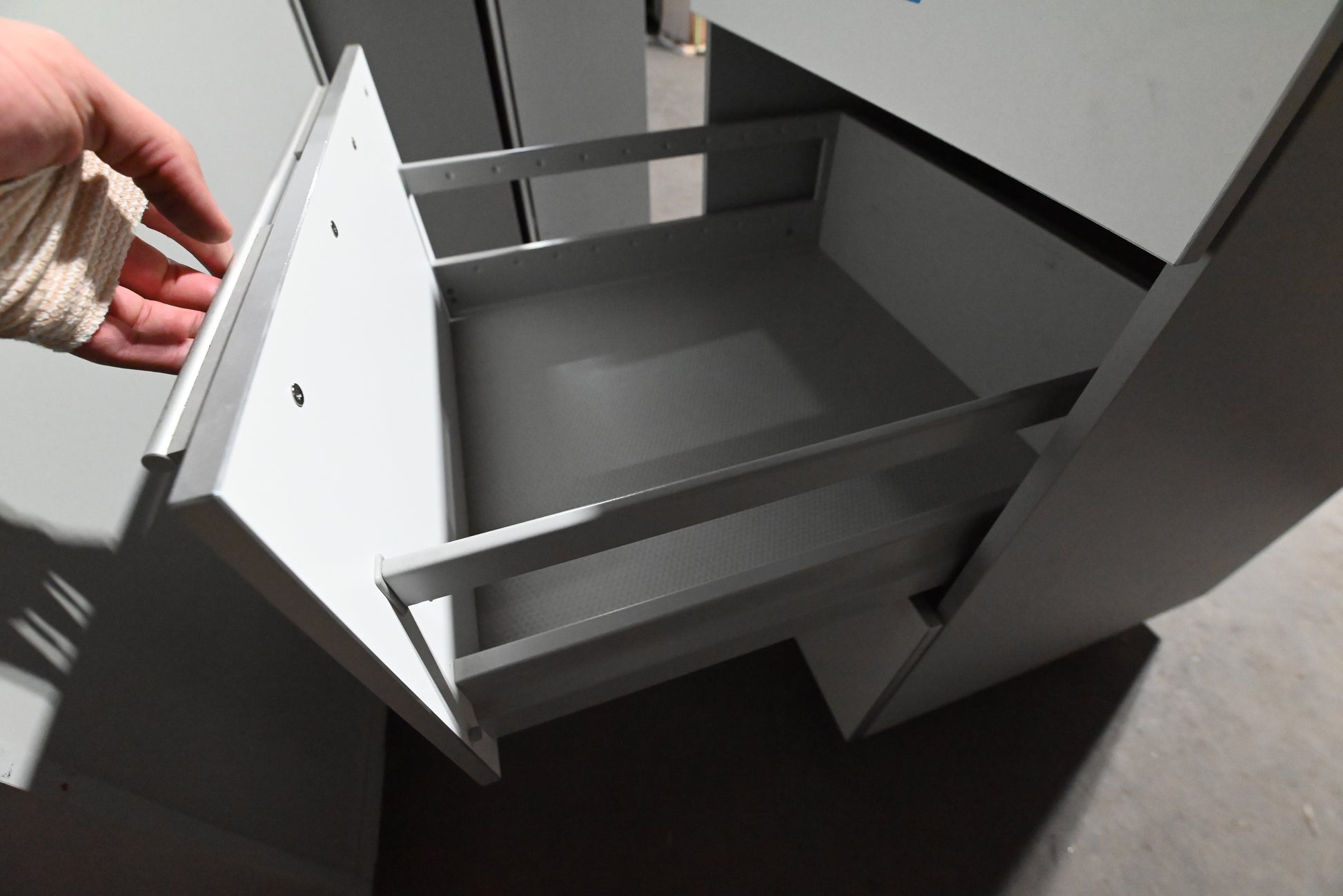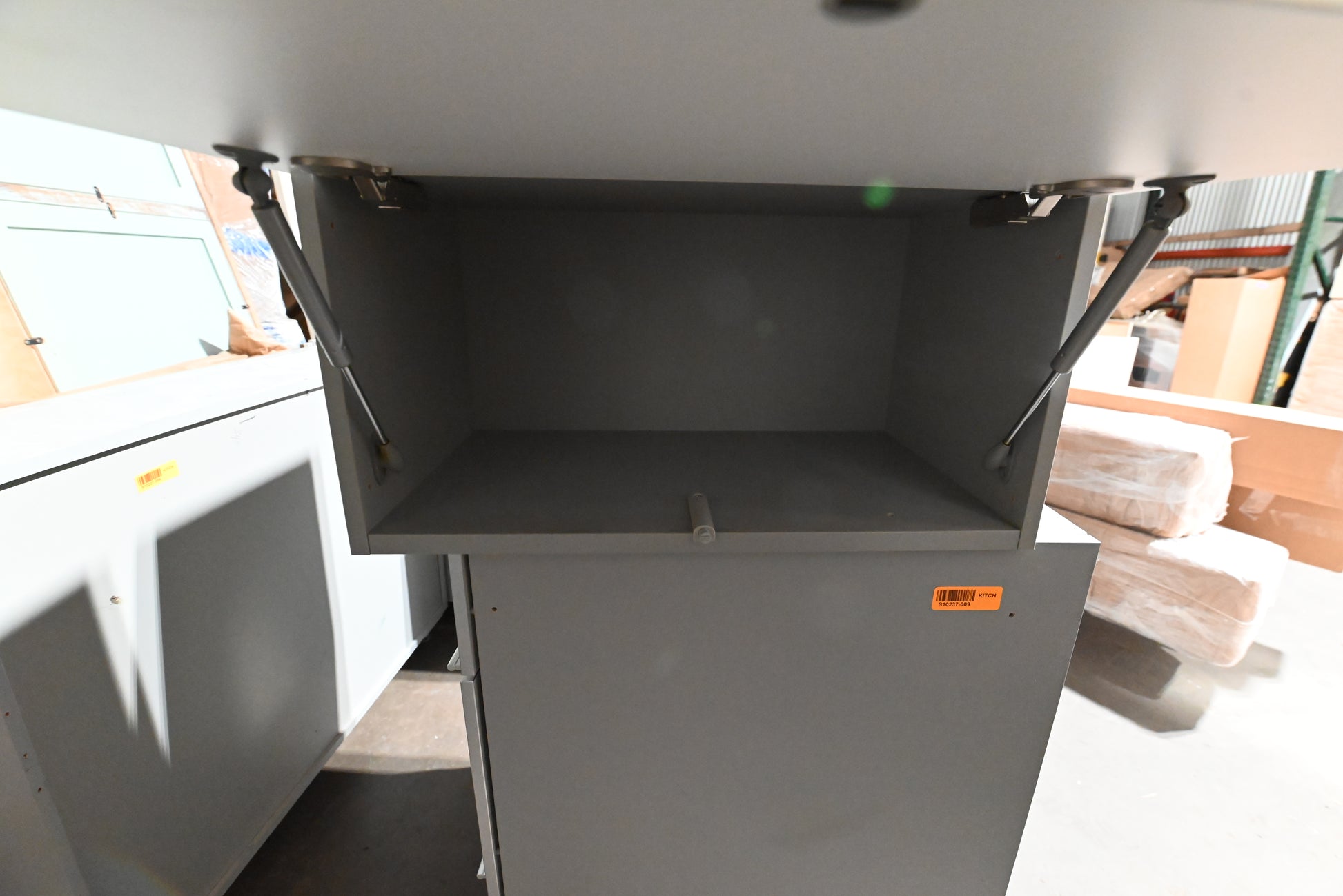 Featuring a smooth matte grey finish, the cabinetry brings a sense of understated elegance and modern appeal, perfect for any contemporary home. Its clean lines and seamless design create a space that is both visually striking and highly functional.