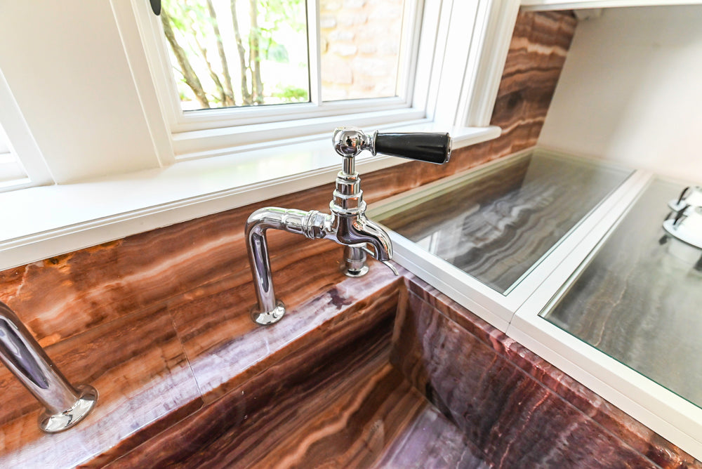 This elegant Christopher Peacock butler's pantry showcases timeless transitional design with crisp white cabinetry and luxurious marble finishes. Crafted with meticulous attention to detail, it features stunning marble countertops and an integrated marble sink, blending form and function with effortless sophistication.