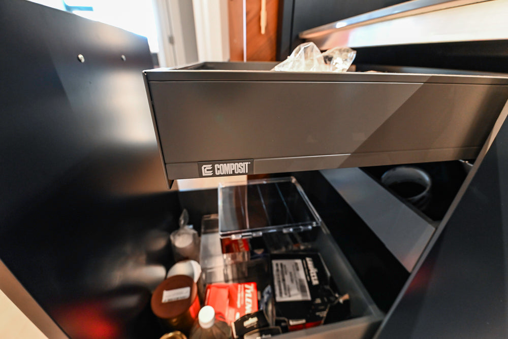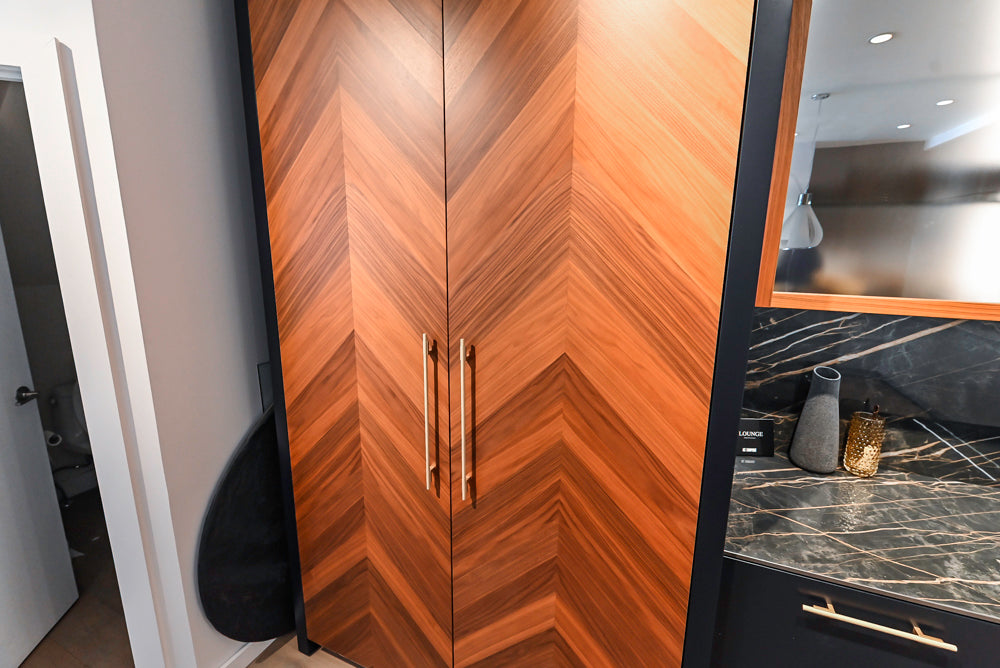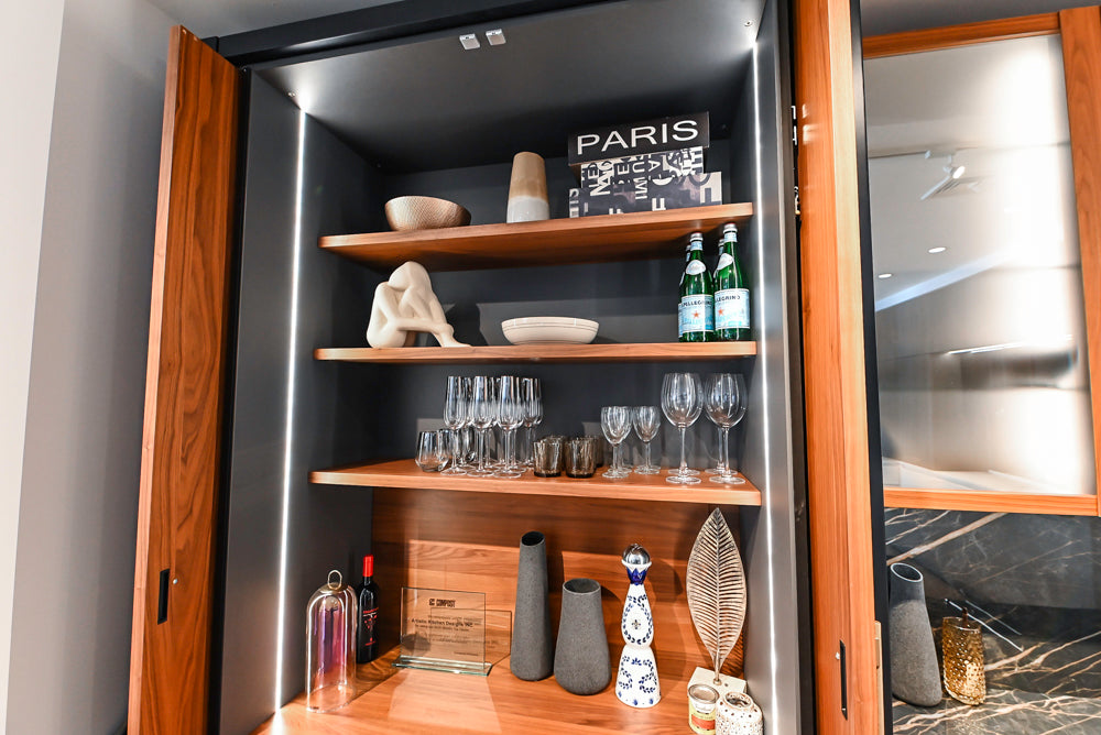 Sleek, functional, and beautifully designed, this Composit Modern Butler’s Pantry features a stylish two-toned finish that pairs warm wood tones with crisp modern cabinetry. The clean quartz countertop offers durability and sophistication, while the integrated sink adds everyday utility—perfect for prep, serving, or added storage space.