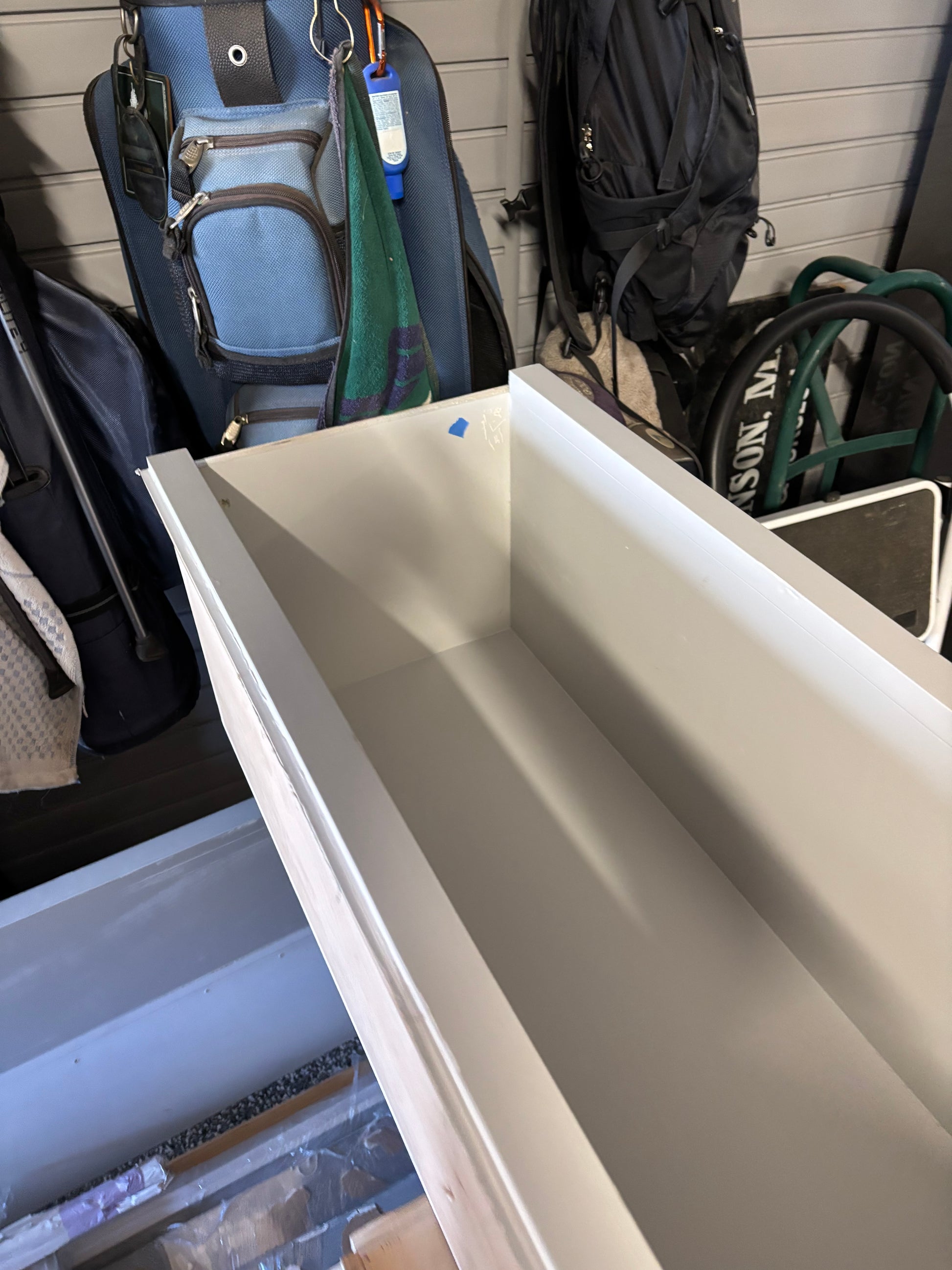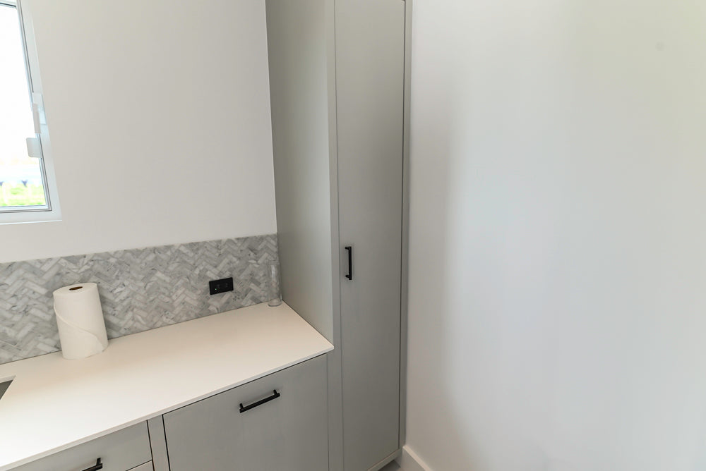 Clean, modern, and thoughtfully designed, this custom light grey pantry offers both style and functionality. With sleek white stone countertops, a stainless steel sink, and built-in appliances, it's the perfect secondary prep or serving space for any luxury kitchen.