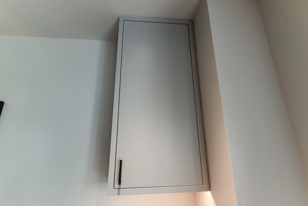 This sleek, custom modern wet bar is the perfect addition to any entertainment space. Featuring elegant light grey cabinetry and striking black stone countertops, it offers both style and function in a compact, high-performance design.