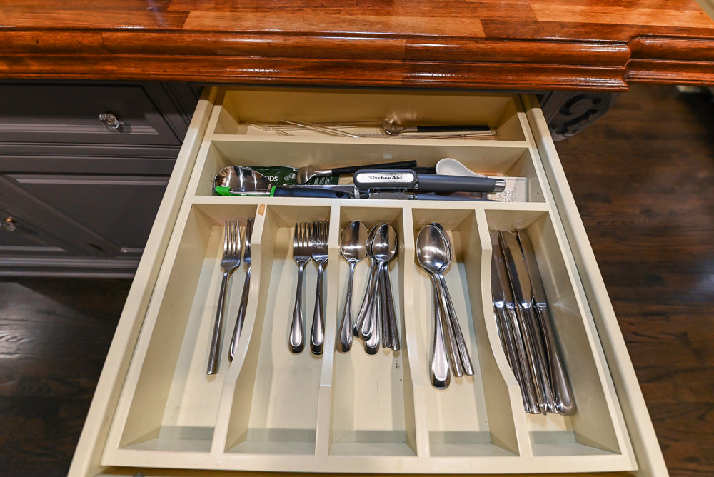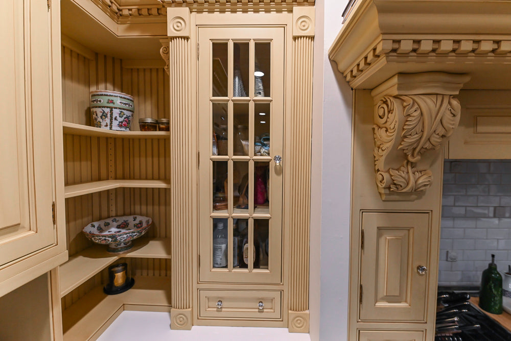 This Custom Traditional “Clive-esque” Kitchen embodies timeless British-inspired luxury and craftsmanship. Designed in the spirit of the iconic Clive Christian aesthetic, it features rich traditional detailing, marble countertops, and a solid wood island top that adds warmth and contrast to the refined design.