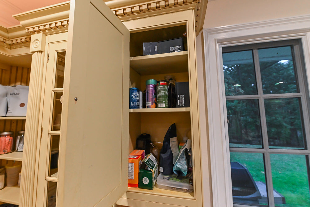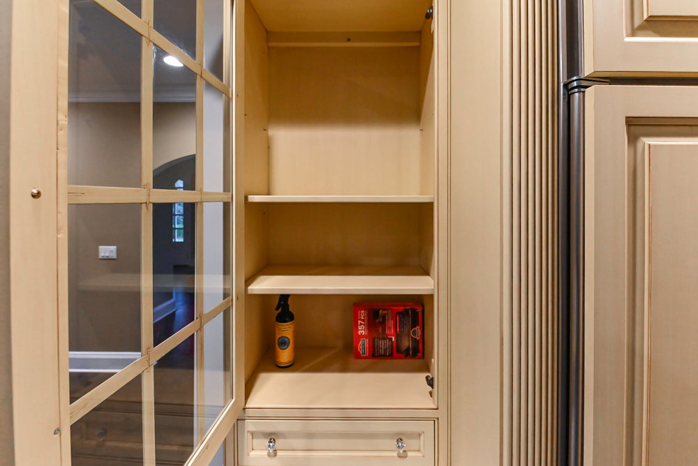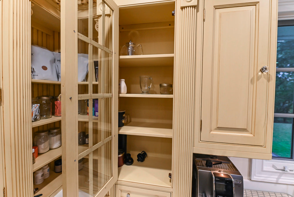 The elegant cabinetry showcases classic raised panel doors, decorative moldings, and furniture-like proportions — creating a kitchen that feels both stately and inviting. High-end appliances are included, blending seamlessly into the layout to provide modern functionality without compromising its traditional charm.