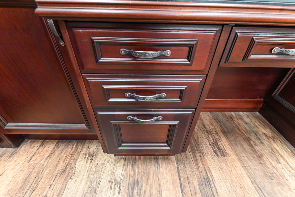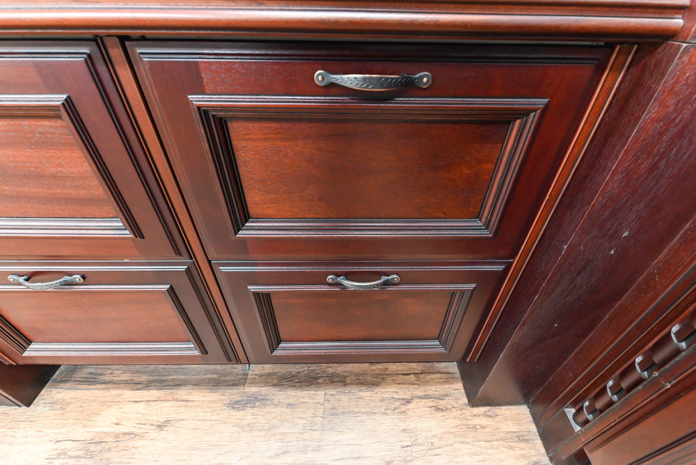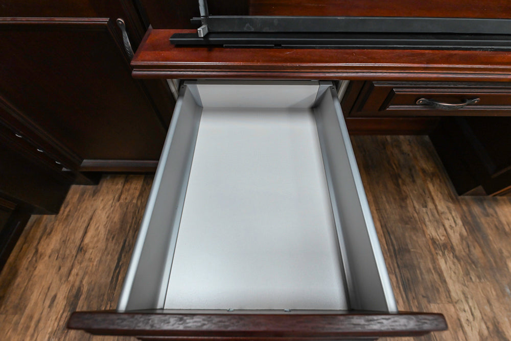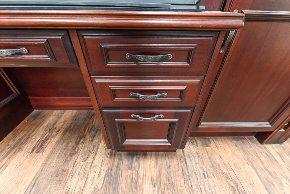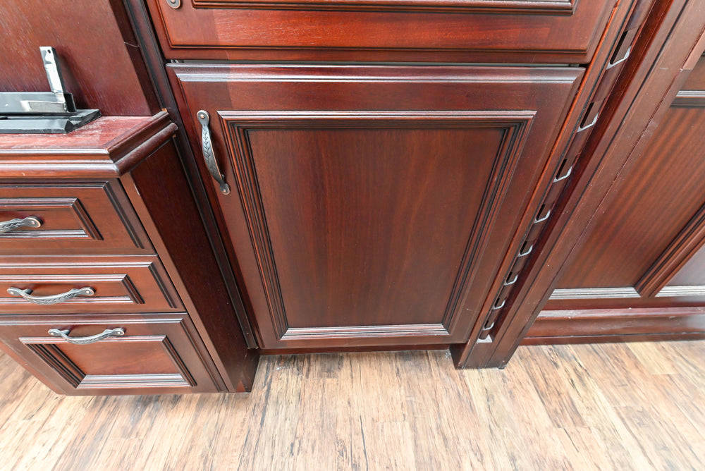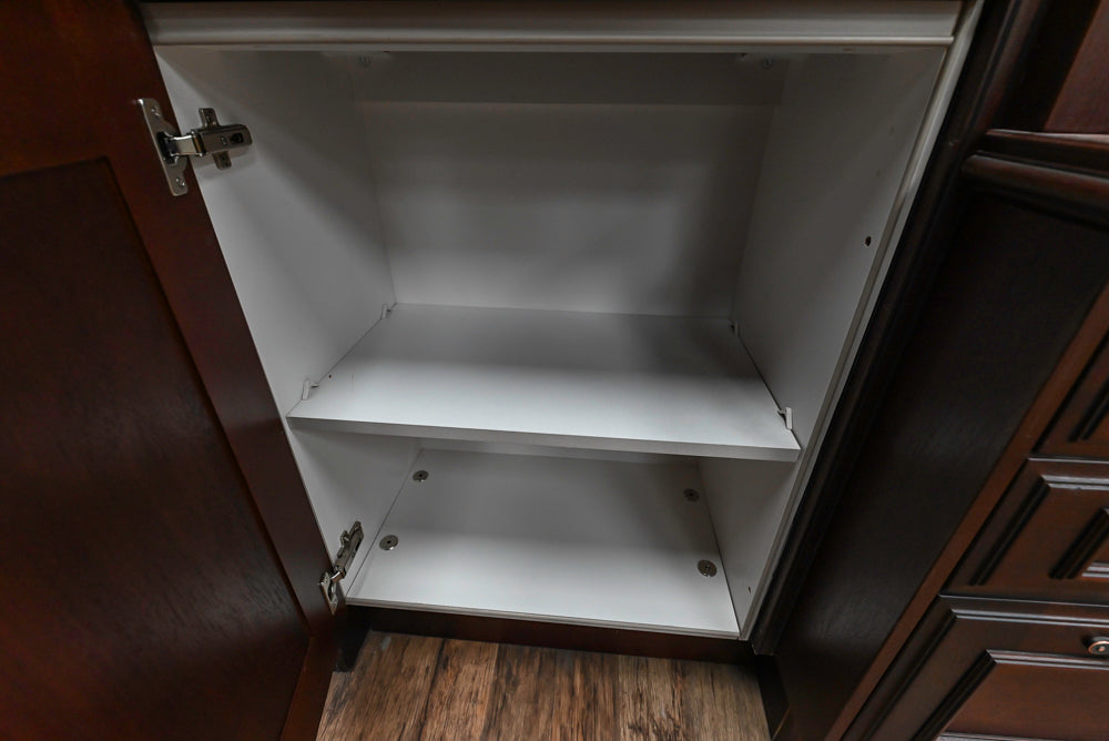 Crafted with stunning attention to detail, this sophisticated piece combines the rich, deep tones of classic brown cabinetry with the charm of a built-in fireplace, creating a cozy yet refined atmosphere in any room.