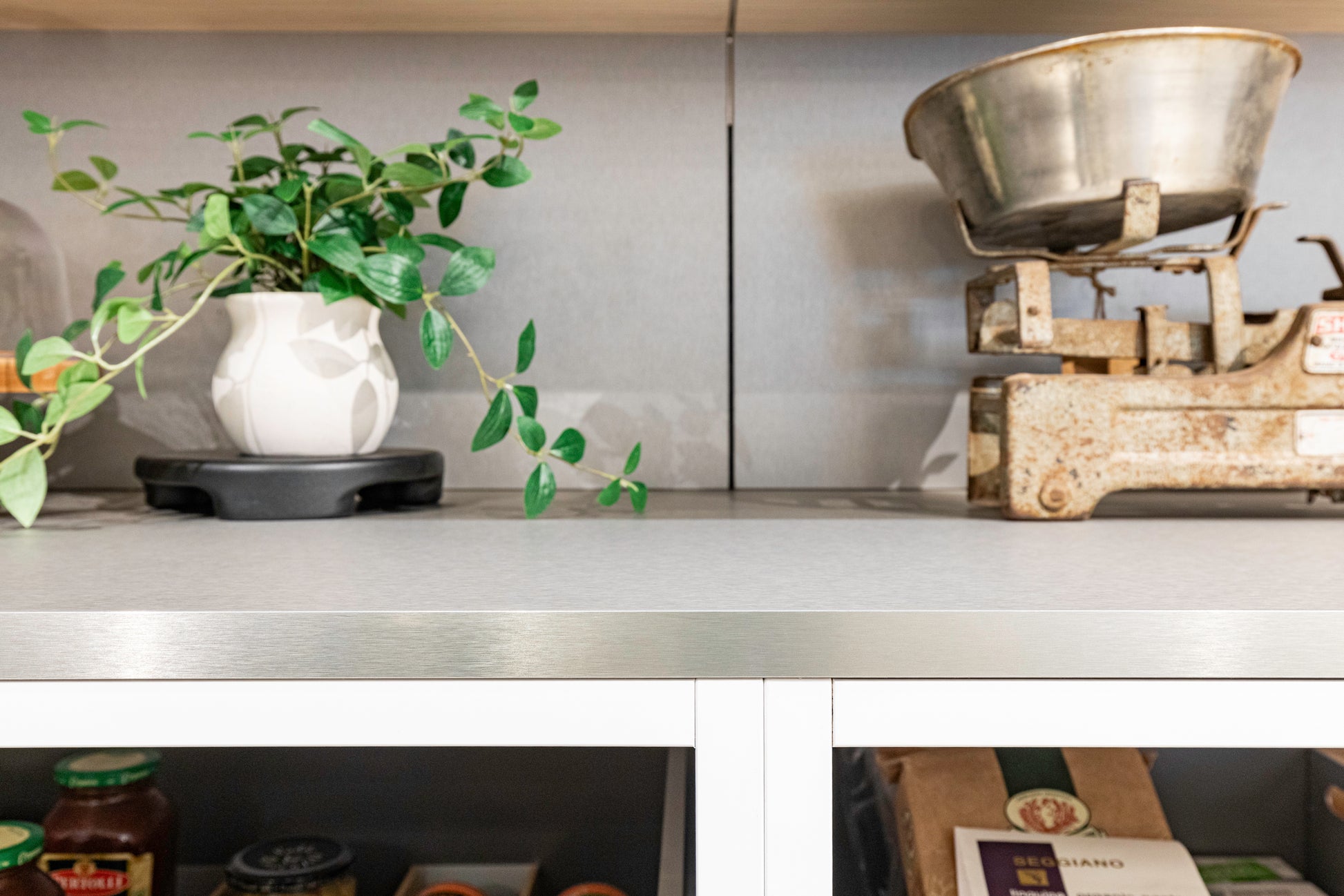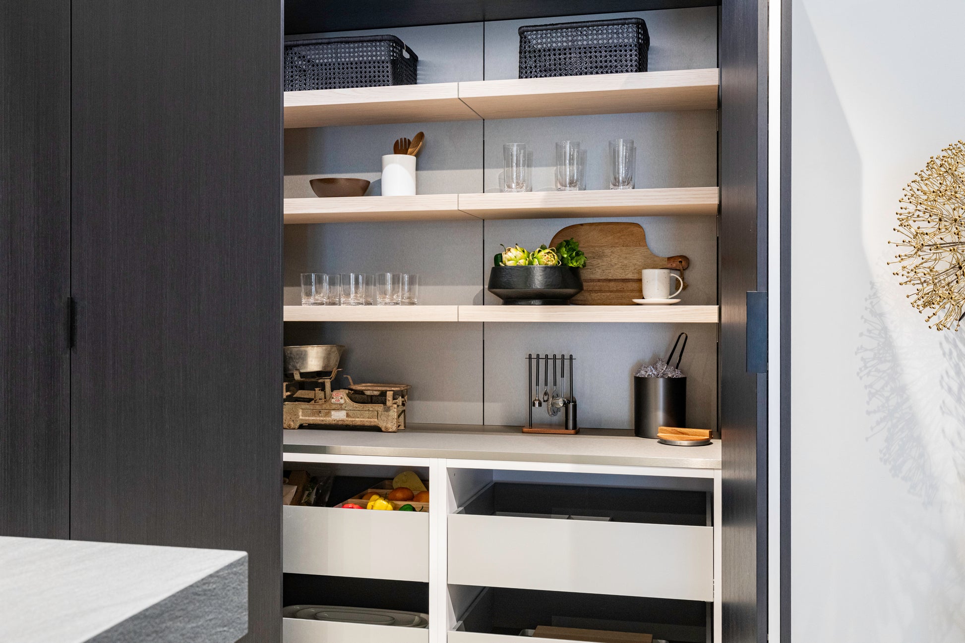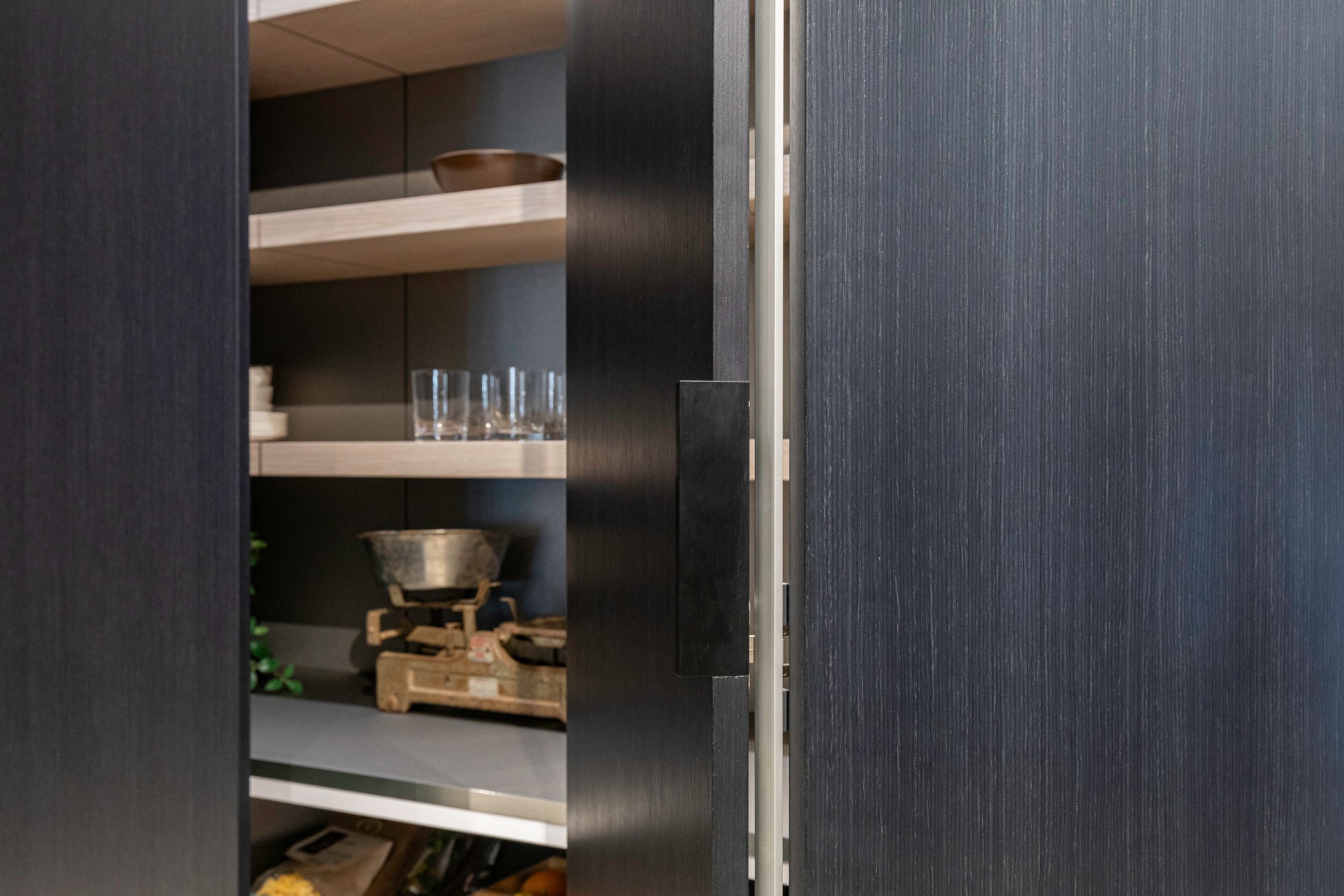 Perfect for open-concept kitchens and minimalist interiors, this pantry wall blends clean-lined design with highly functional organization, creating a refined space where everything has its place—yet nothing is on display unless you want it to be.