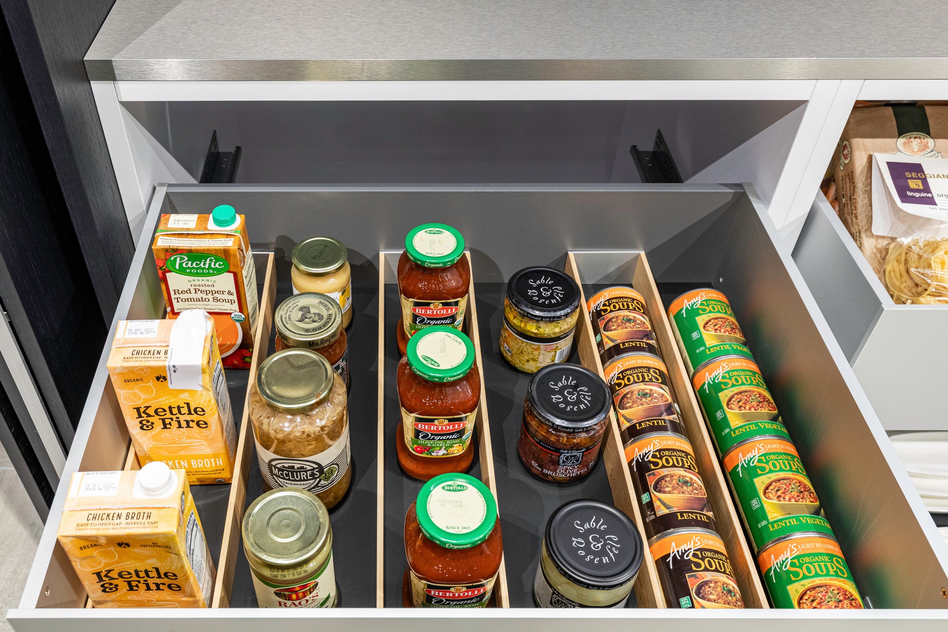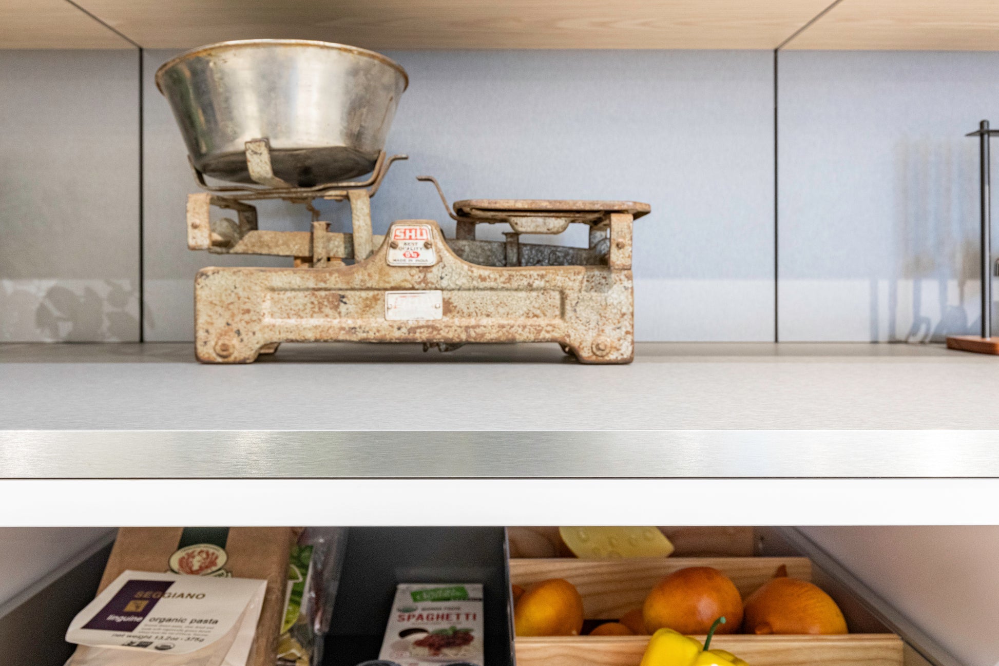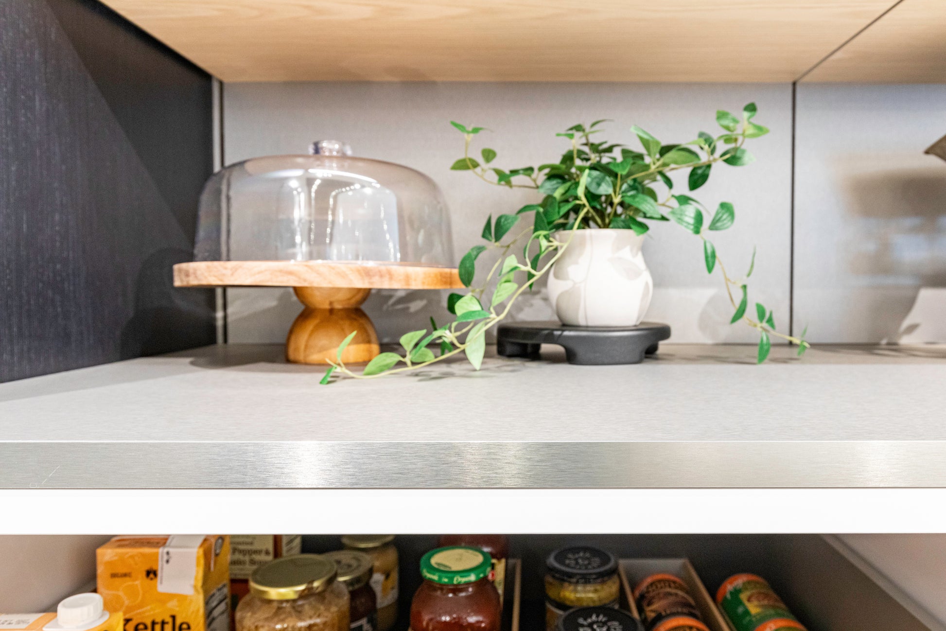 Perfect for open-concept kitchens and minimalist interiors, this pantry wall blends clean-lined design with highly functional organization, creating a refined space where everything has its place—yet nothing is on display unless you want it to be.