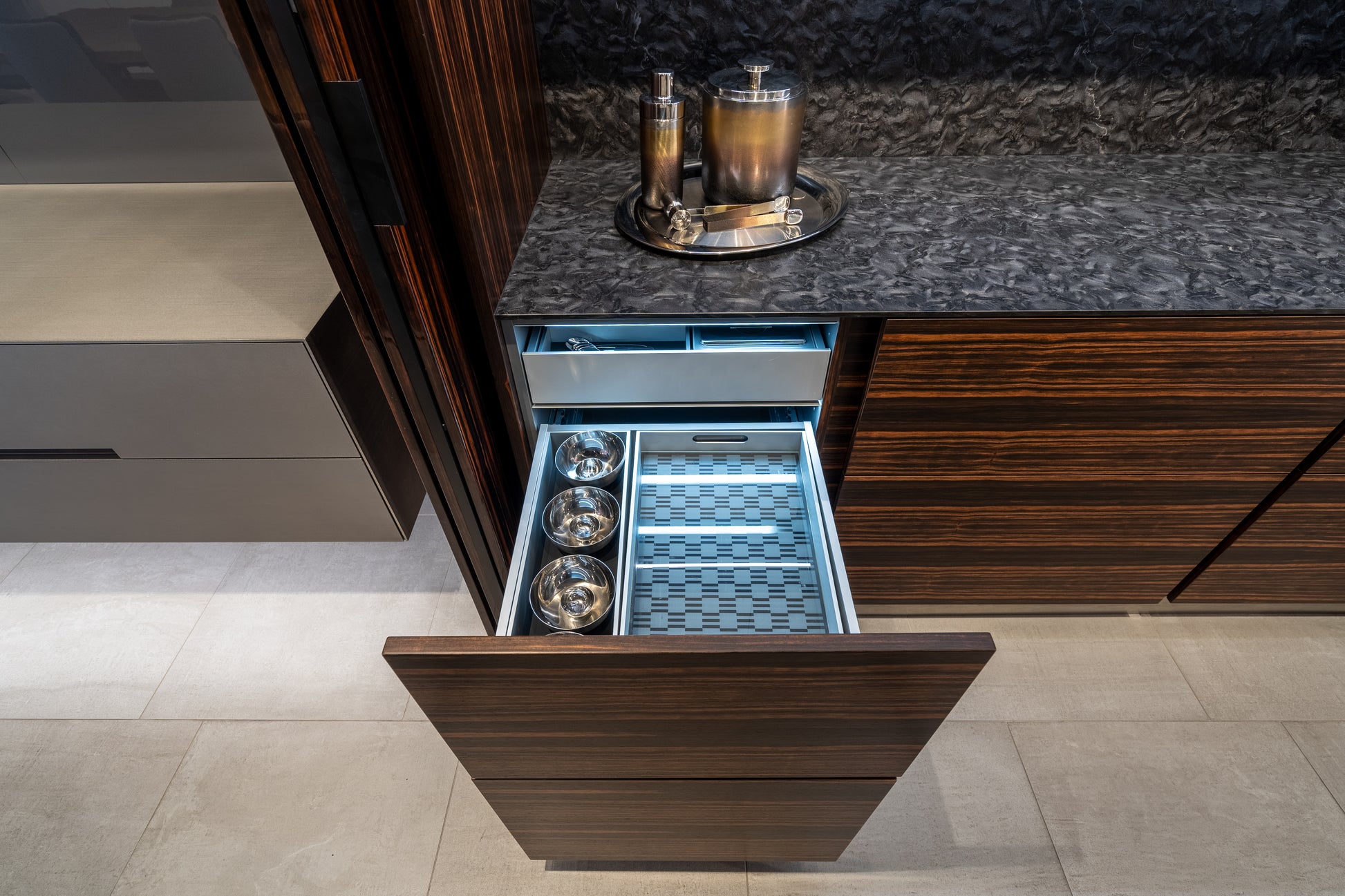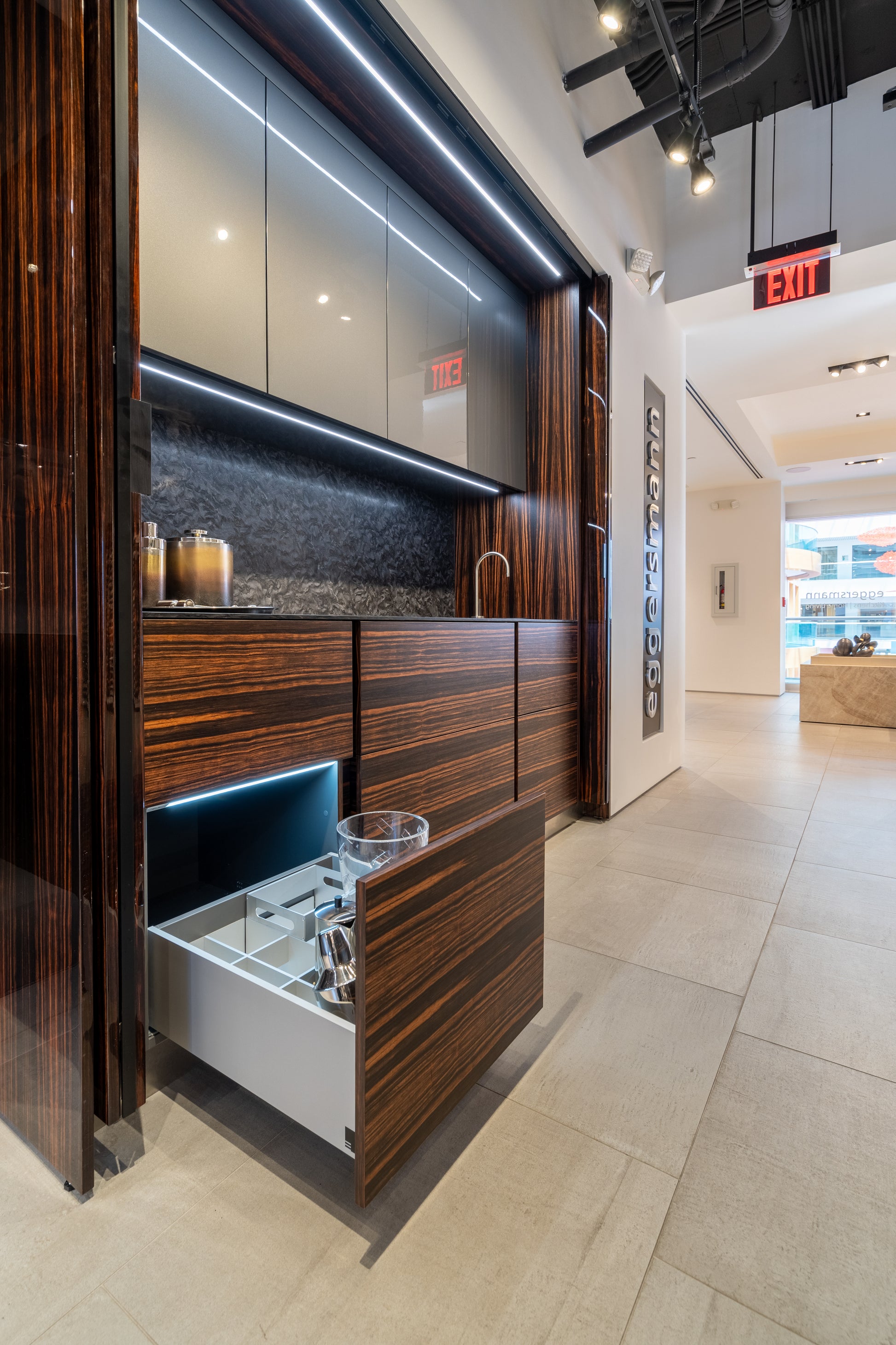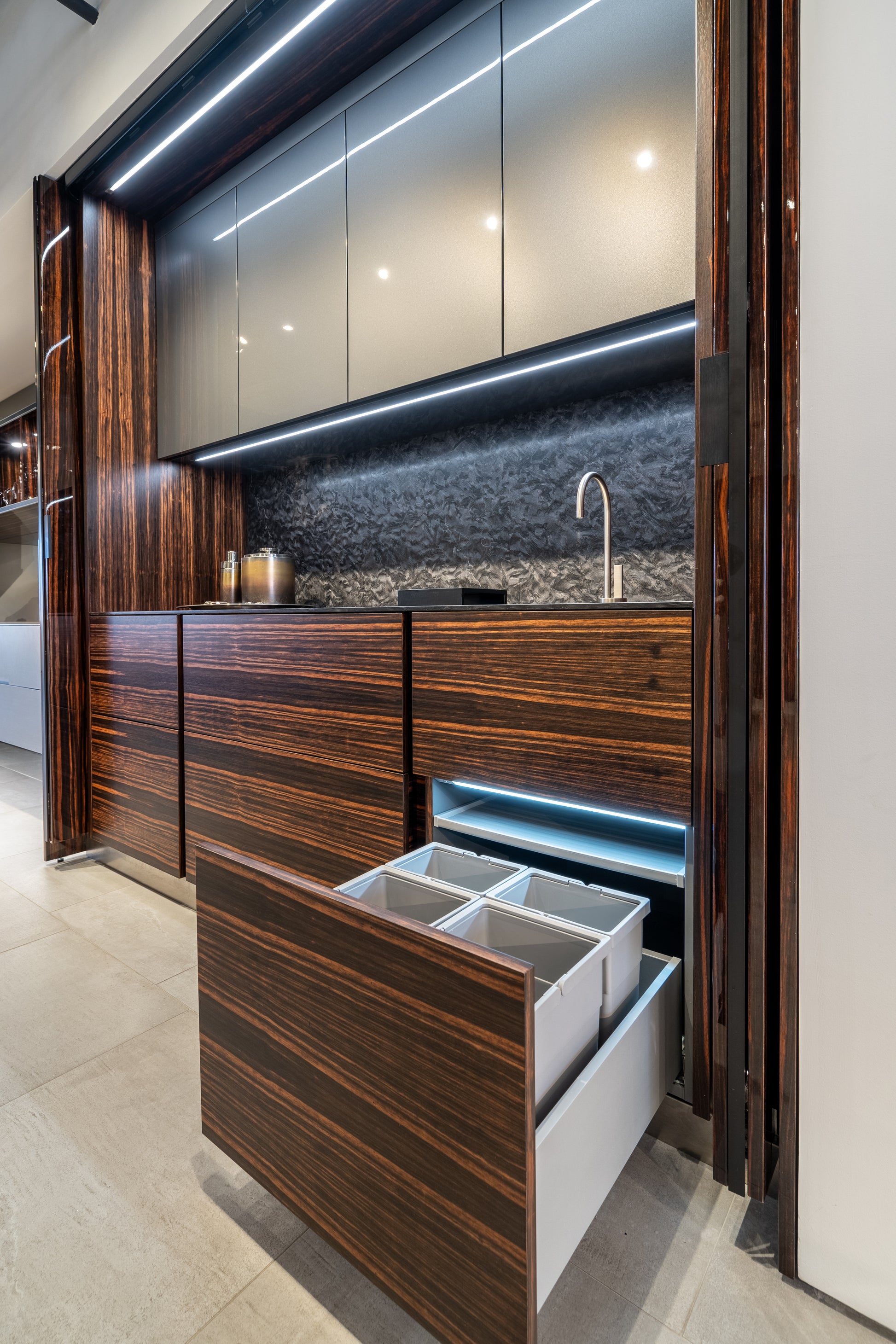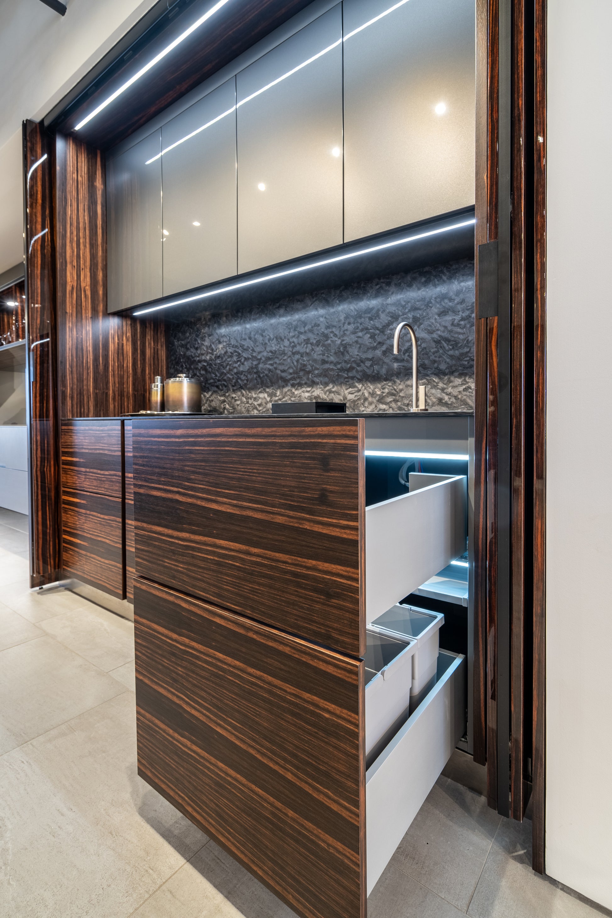Elevate your entertaining space with this stunning eggersmann modern bar, where sleek sophistication meets functional design. Featuring a dynamic contrast of matte and high gloss finishes, this bar is accented with luxurious Makassar wood details for a bold yet refined look. The sliding mirror door adds both visual drama and practical concealment, transforming the space with a smooth glide.
