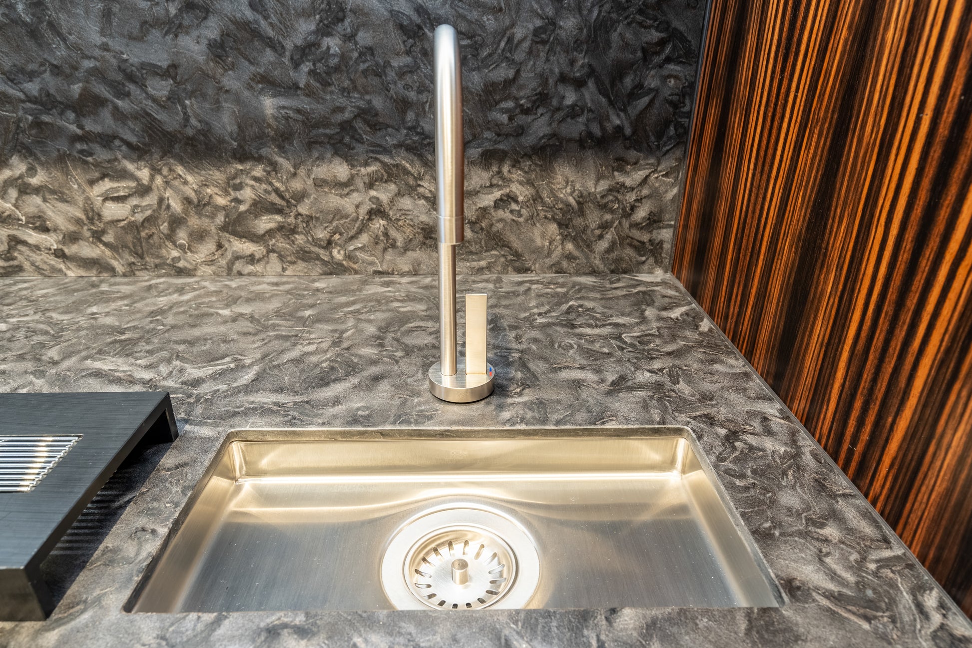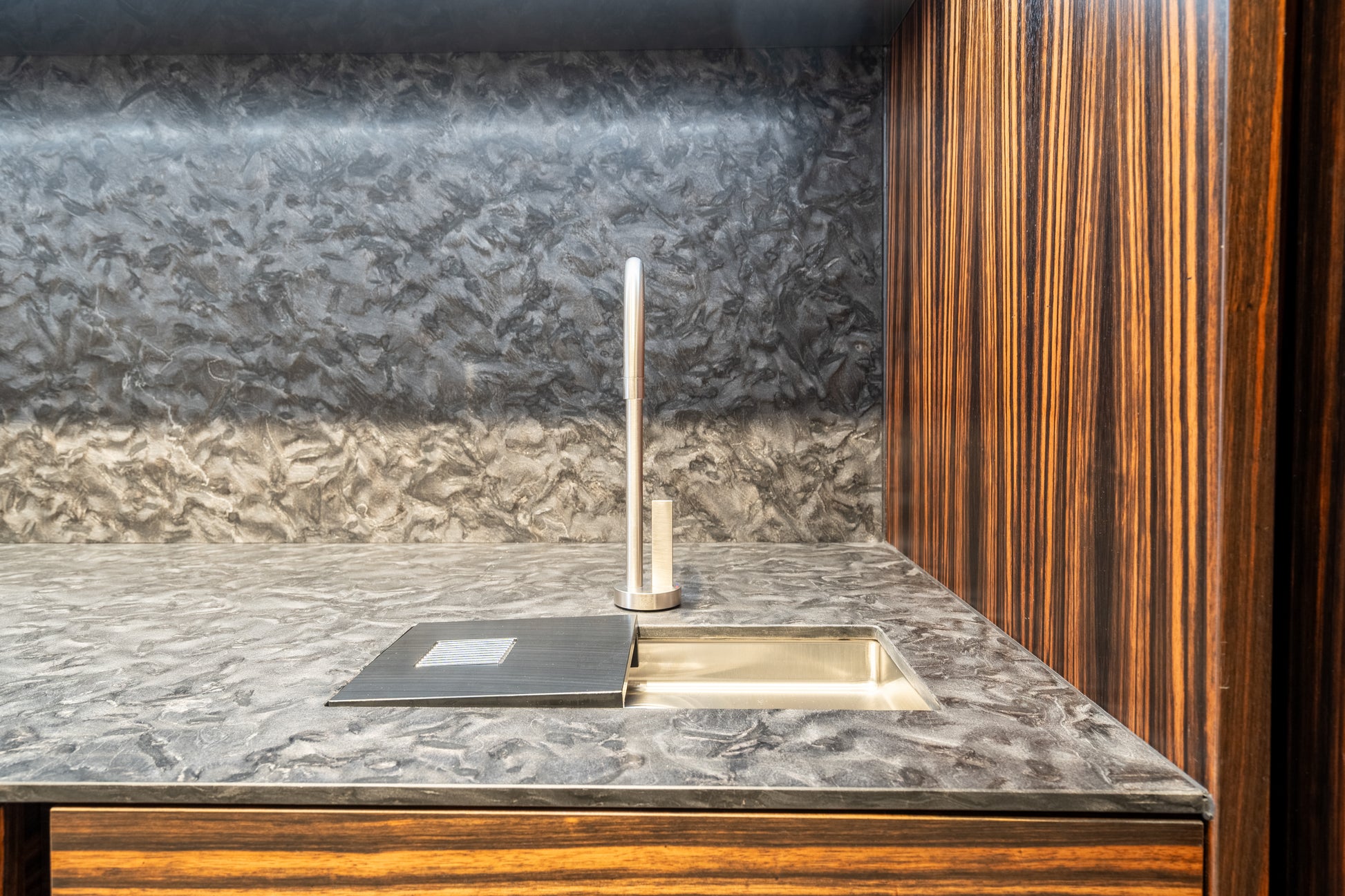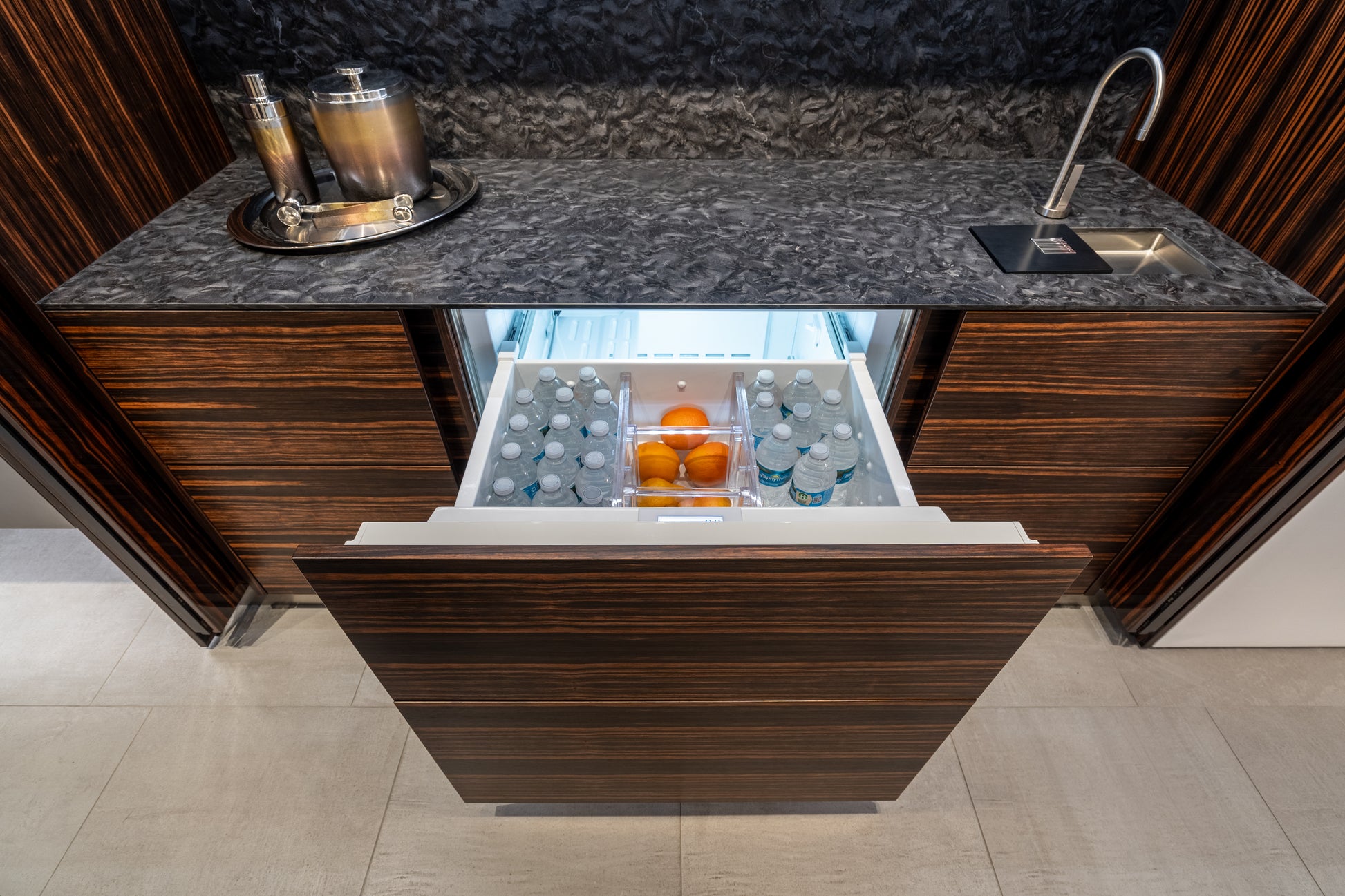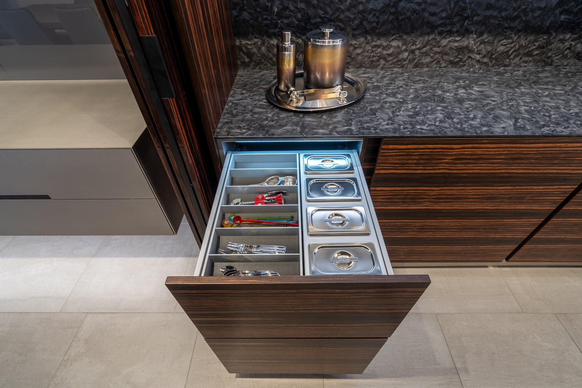 Elevate your entertaining space with this stunning eggersmann modern bar, where sleek sophistication meets functional design. Featuring a dynamic contrast of matte and high gloss finishes, this bar is accented with luxurious Makassar wood details for a bold yet refined look. The sliding mirror door adds both visual drama and practical concealment, transforming the space with a smooth glide.