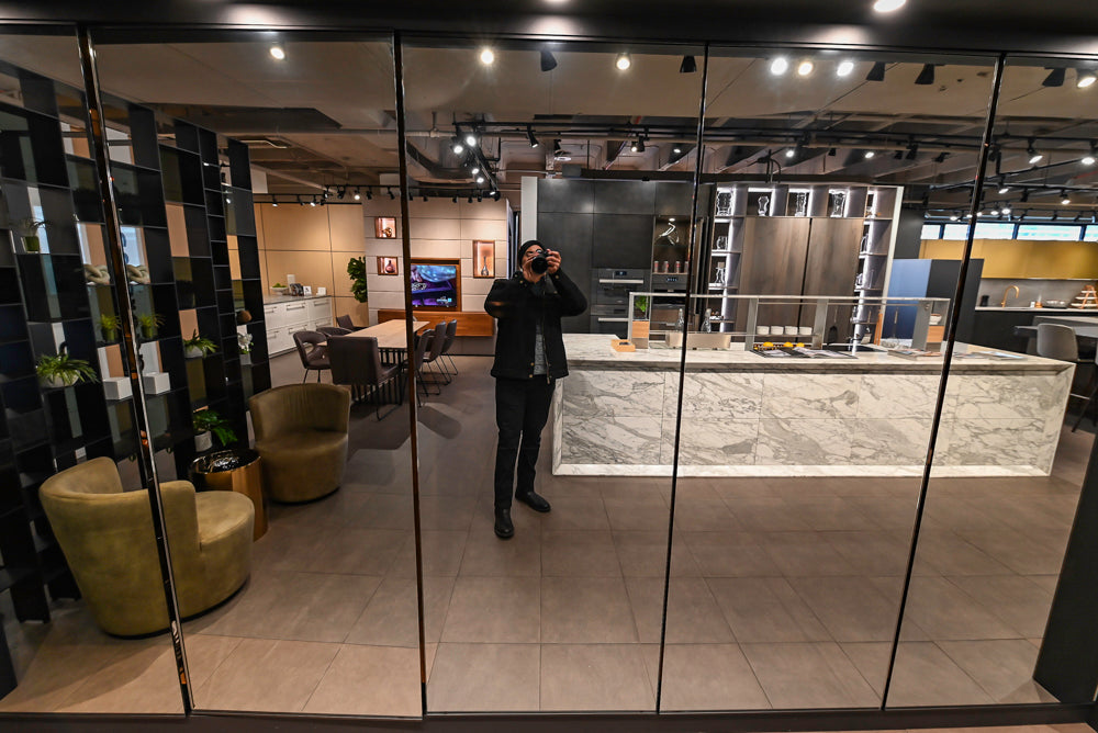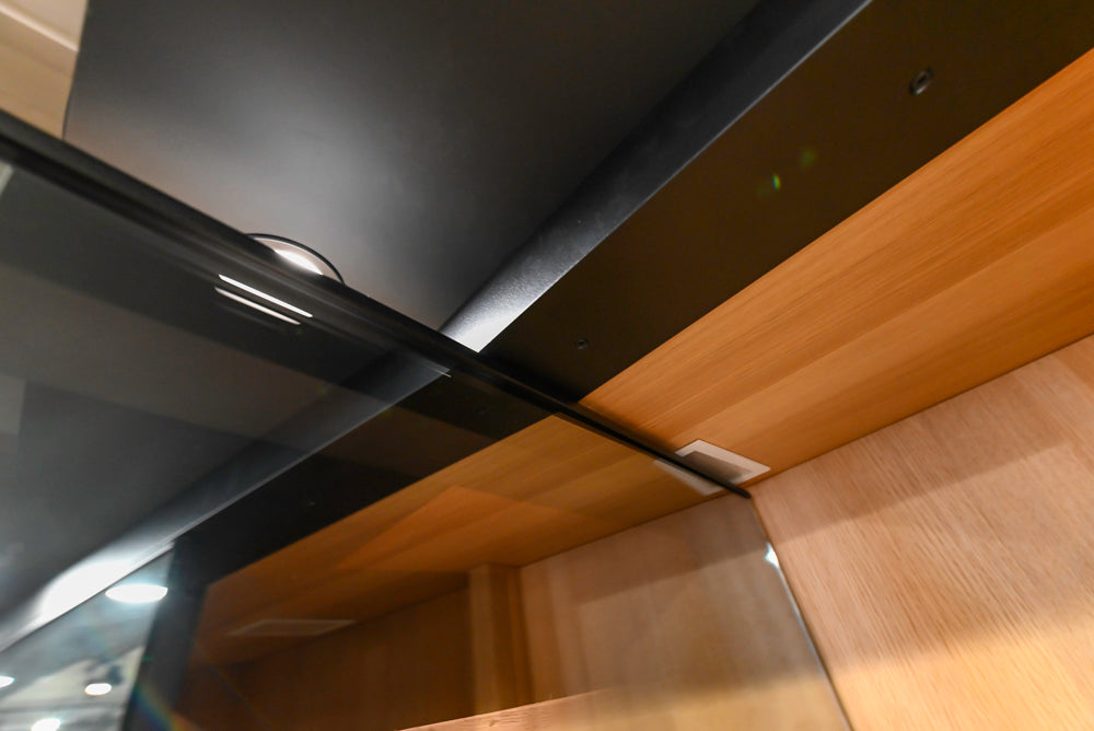 The work’s pantry systems are fronted with glass panels that reflect light throughout.