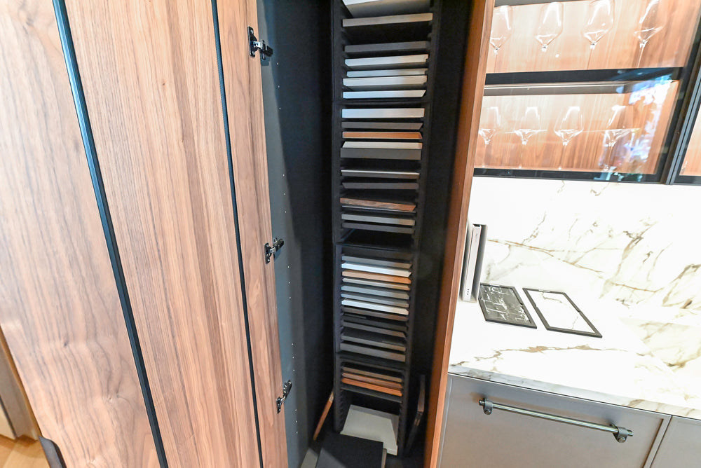 Sleek Italian design meets natural sophistication in this Key Cucine modern kitchen, featuring elegant wood-veneered cabinetry and striking Neolith stone countertops and island. Crafted with precision and attention to detail, this kitchen balances warmth and contemporary minimalism, offering a refined aesthetic that complements both open-plan and traditional layouts.