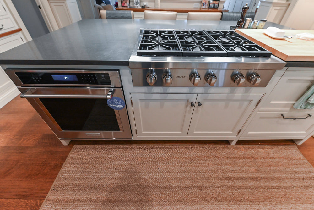 At the center of this kitchen is a generously sized island, providing both prep space and seating, making it the perfect spot for family gatherings or casual meals. The island's classic design complements the traditional theme of the space while offering ample storage for kitchen essentials.