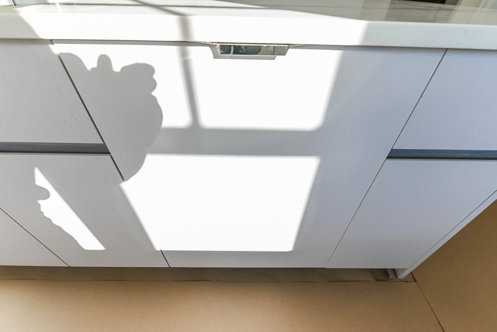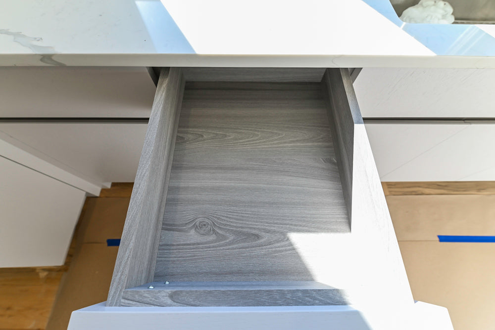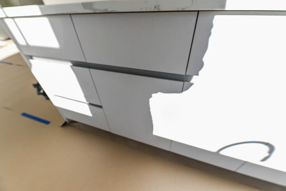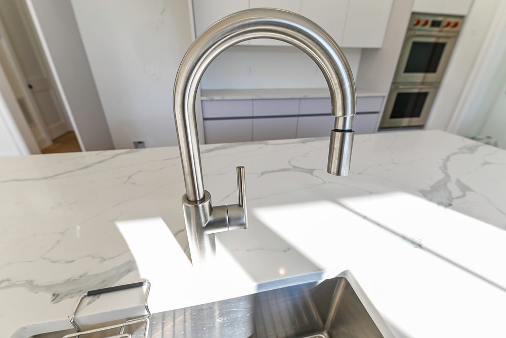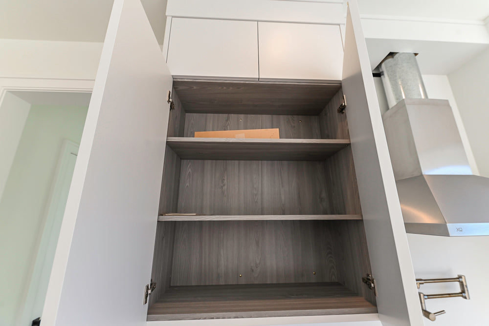 The luxurious quartz countertops further elevate the design, offering a durable and visually stunning surface. Known for its exceptional strength and resilience, quartz is resistant to scratches, stains, and heat, making it the ideal material for a high-traffic kitchen. The countertops’ smooth, polished finish and subtle veining provide a sophisticated touch that pairs beautifully with the glossy cabinetry.
