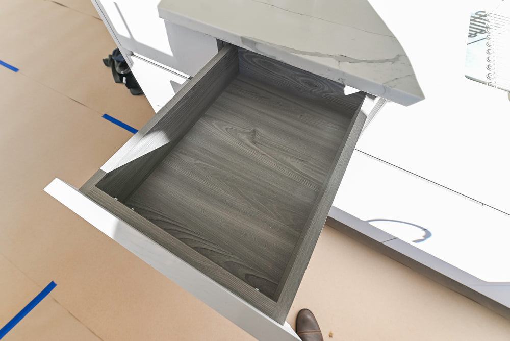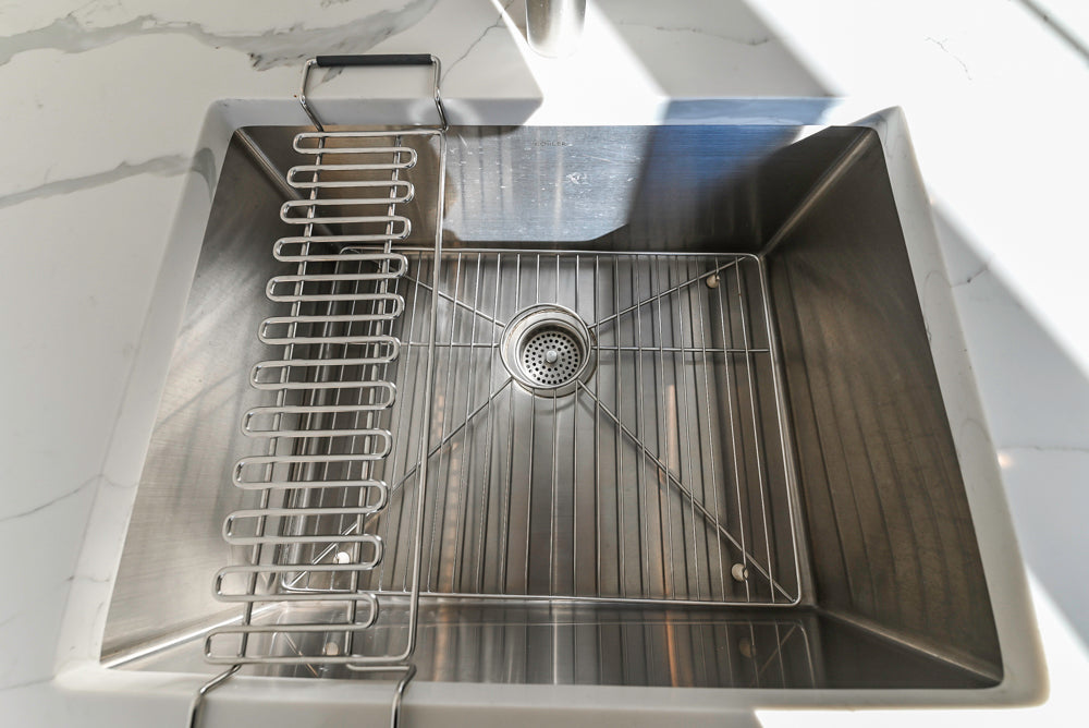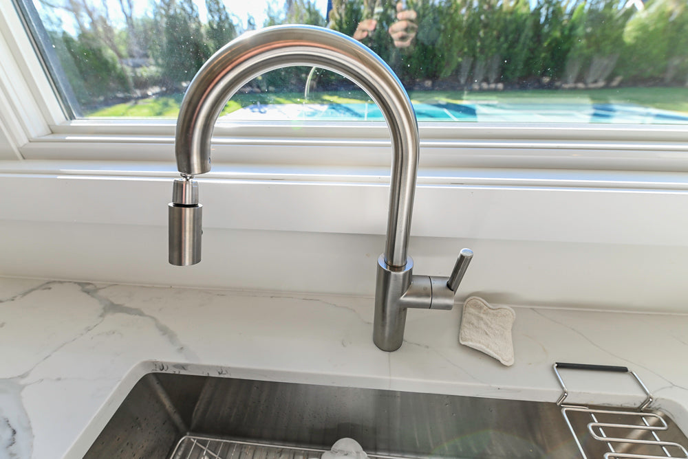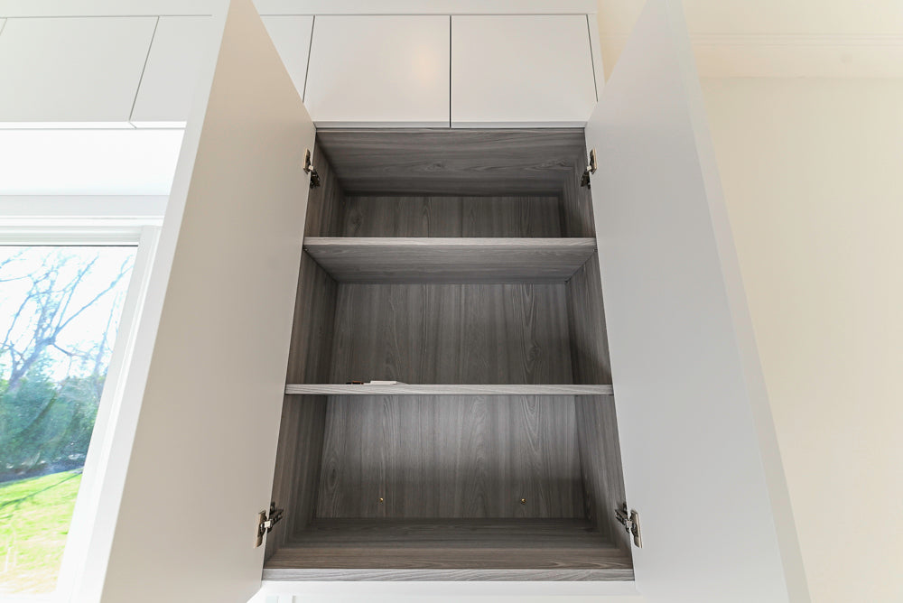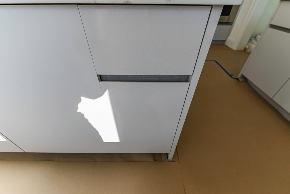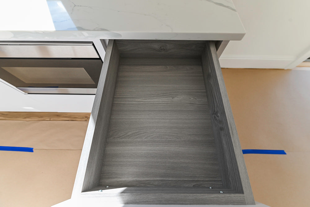 The luxurious quartz countertops further elevate the design, offering a durable and visually stunning surface. Known for its exceptional strength and resilience, quartz is resistant to scratches, stains, and heat, making it the ideal material for a high-traffic kitchen. The countertops’ smooth, polished finish and subtle veining provide a sophisticated touch that pairs beautifully with the glossy cabinetry.