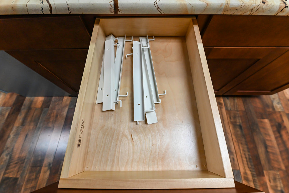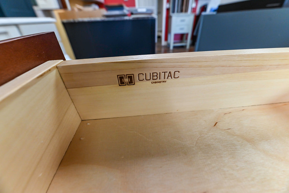 The island stands out with rich CUBITAC cabinetry topped with a stunning marble surface for a perfect blend of contrast and warmth. Paired with sleek quartz countertops along the perimeter, this layout offers both form and function in a compact, transitional design.