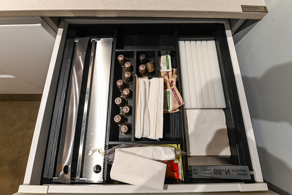 Silestone countertops elevate the design with a durable, easy-to-clean surface that stands up to everyday use while adding a polished finish. With thoughtful storage, integrated open shelving, and clean lines, this kitchenette balances functionality with refined contemporary design.