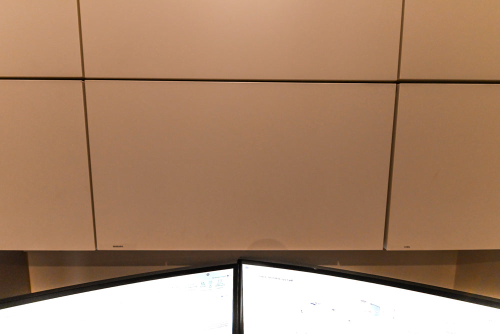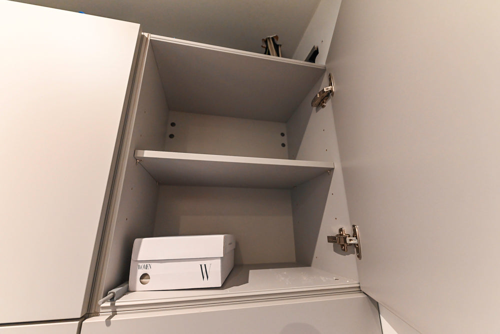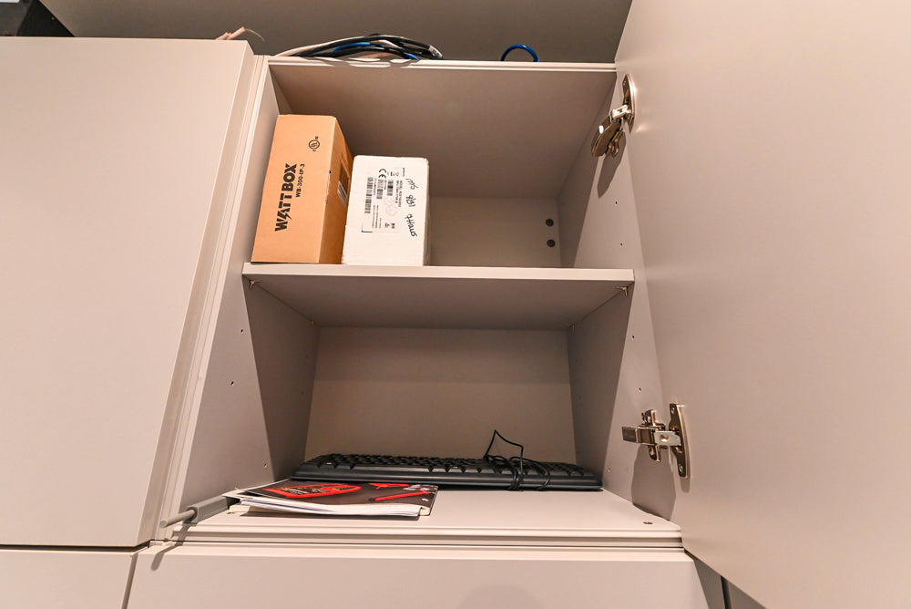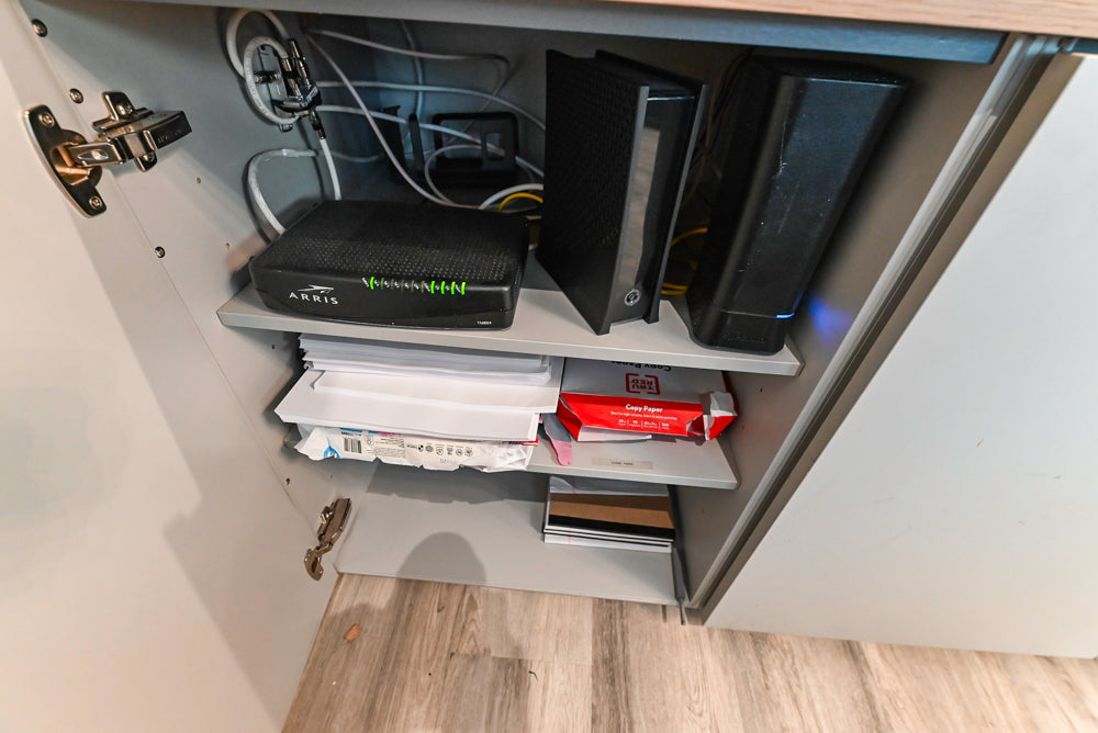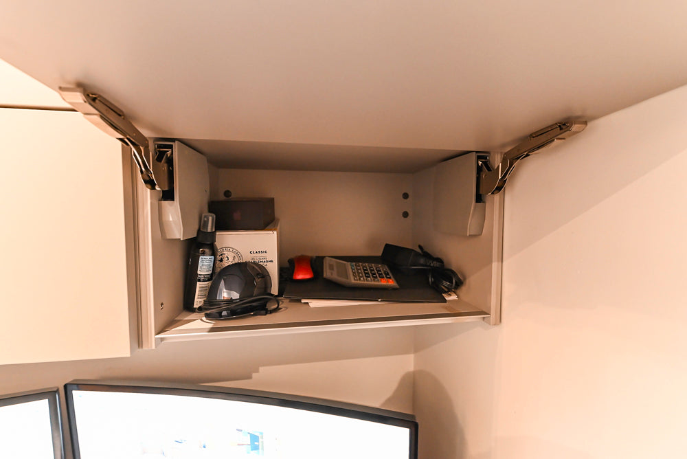 At the heart of this desk area is the wood countertop, which adds a natural, inviting warmth to the otherwise cool-toned design. The countertop provides a spacious, durable surface for all your work essentials—whether you're typing away on your laptop, brainstorming creative ideas, or organizing paperwork.