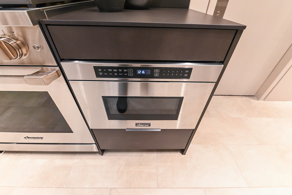 Transform your culinary space with the sleek elegance of the Poggenpohl Dark Brown Modern Kitchenette, a sophisticated blend of luxury and functionality. This contemporary design is crafted from high-quality materials, featuring rich dark brown cabinetry with clean lines and a minimalist aesthetic. Paired with top-tier Dacor Appliances, known for their cutting-edge technology and superior performance, this kitchenette offers a seamless cooking experience.