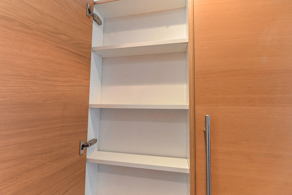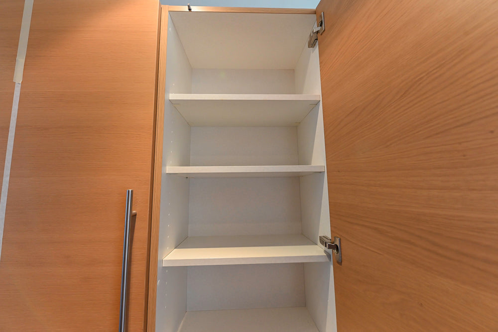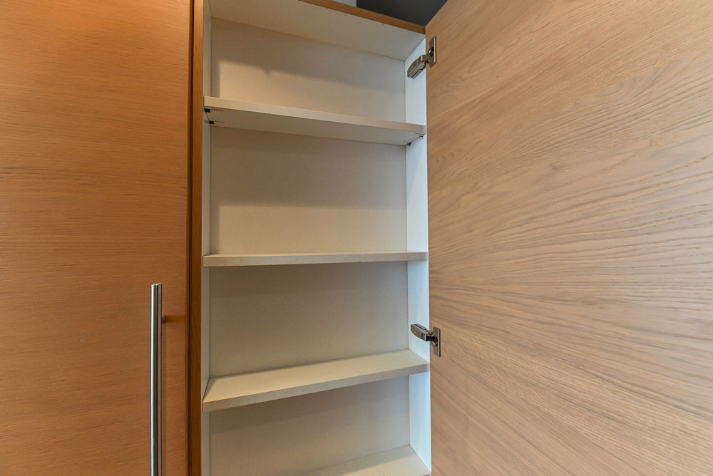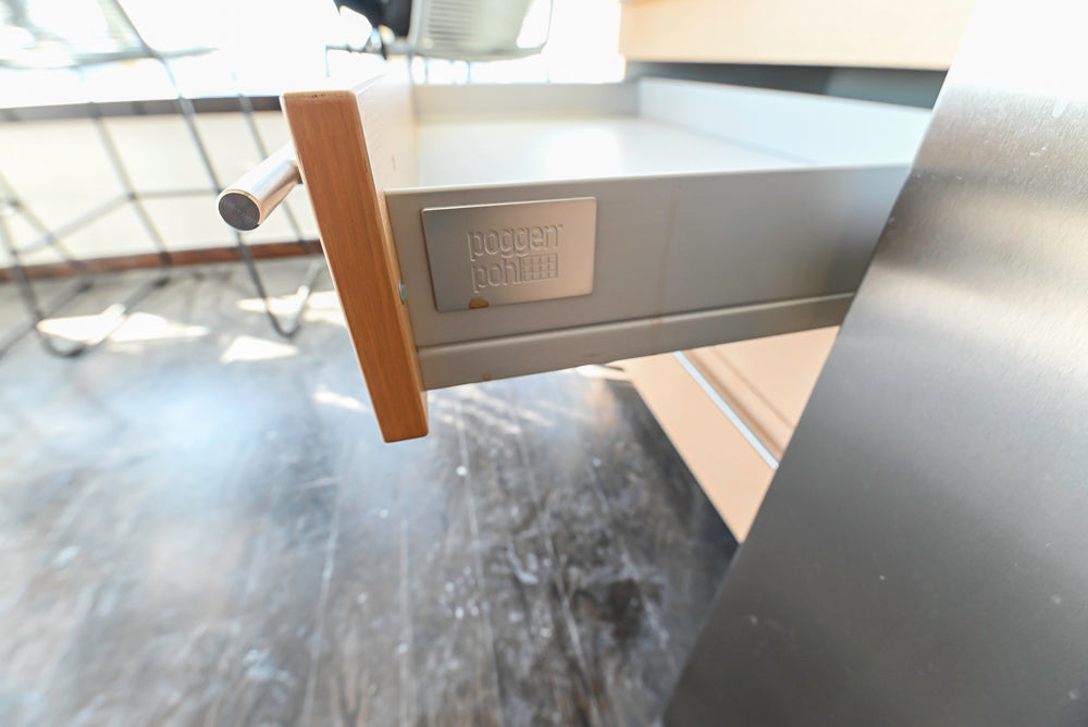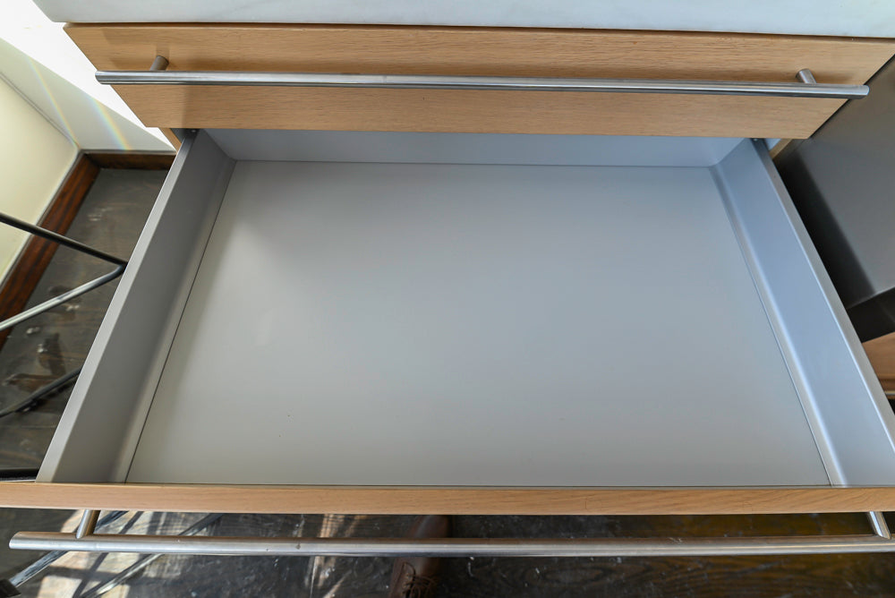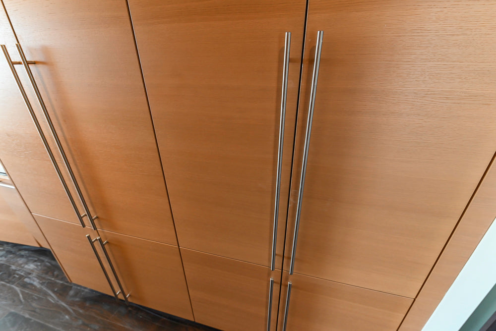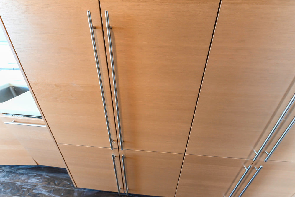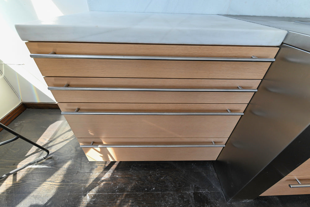 This Poggenpohl Modern Kitchen combines sleek contemporary design with warm, natural elegance. Featuring light wood veneer cabinetry and white marble countertops with subtle veining, it delivers a refined, timeless aesthetic.
