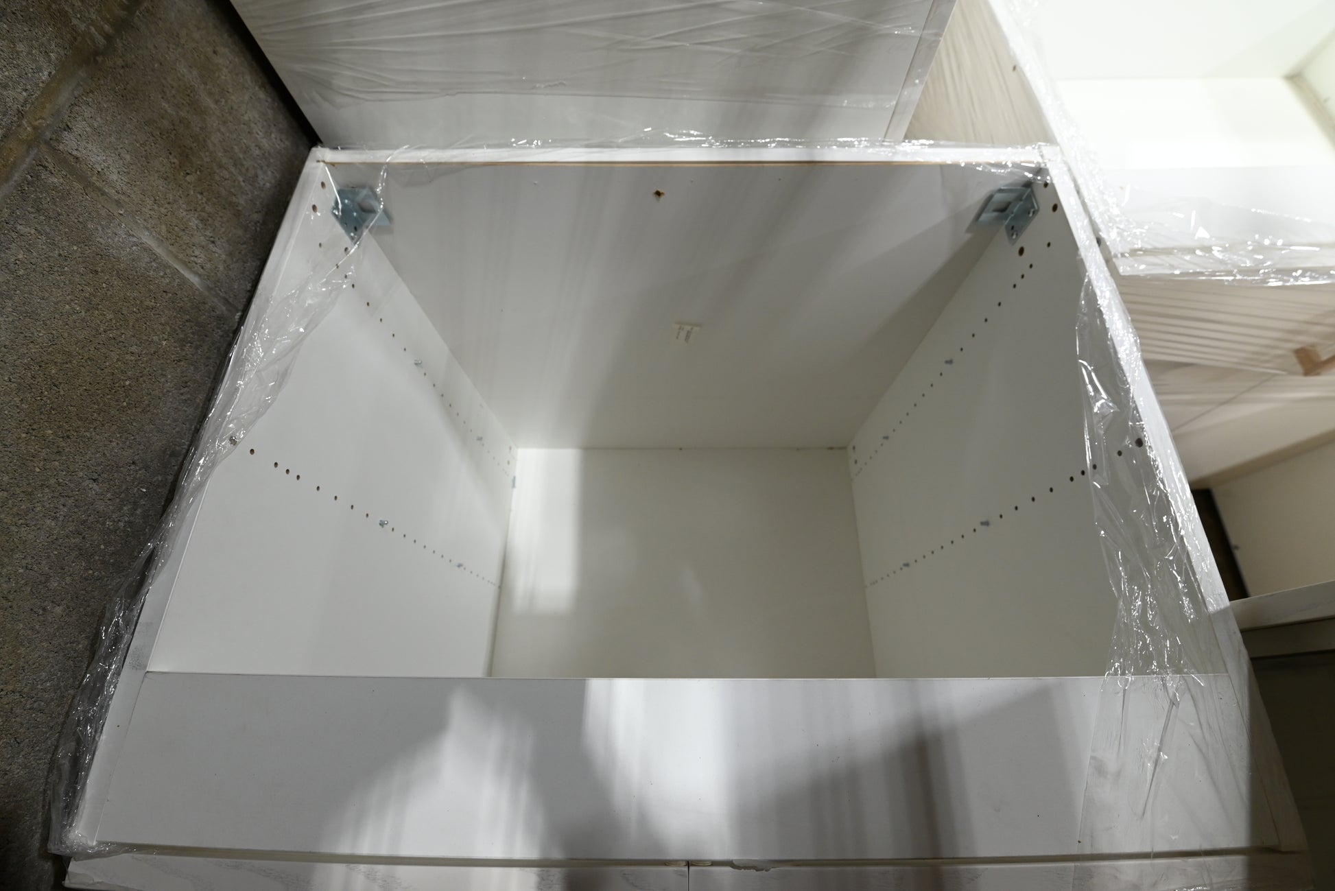 The crisp white cabinetry creates a clean, contemporary aesthetic, while the marble countertop adds elegance and durability for everyday use. The included sink and faucet provide a complete, turnkey solution, ready for installation. Thoughtfully designed partial cabinets offer essential storage and countertop space, making this modern kitchen setup ideal for smaller spaces, secondary kitchen areas, or elegant kitchenette designs.