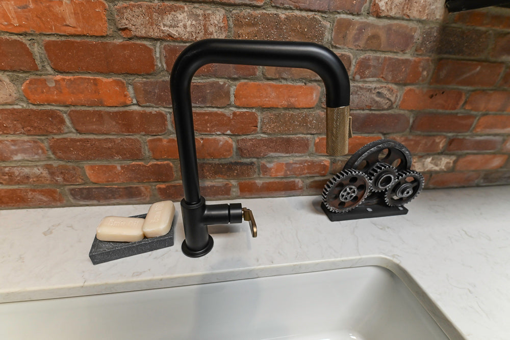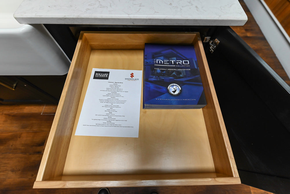 This stunning design blends the sleek sophistication of black cabinetry with the crisp contrast of white accents, creating a striking and modern aesthetic. The industrial-inspired finishes add an urban edge to this space, making it perfect for those who appreciate a chic yet functional kitchen.