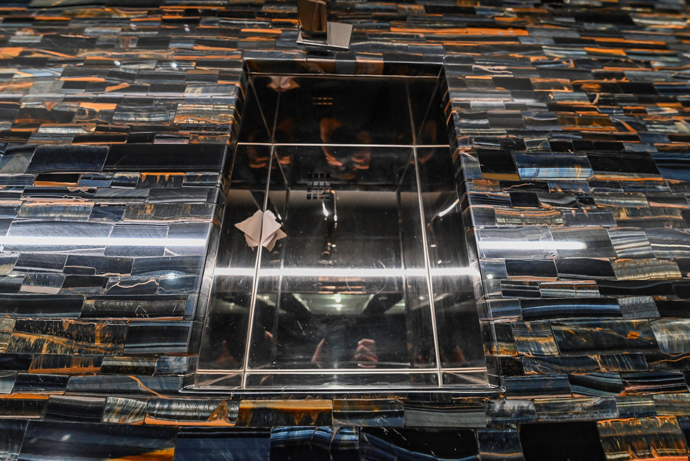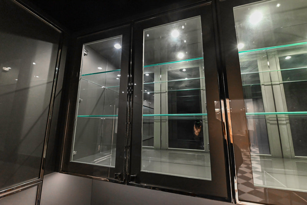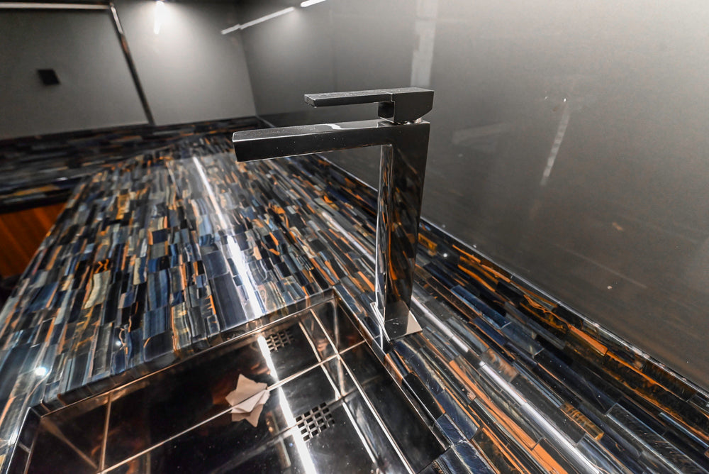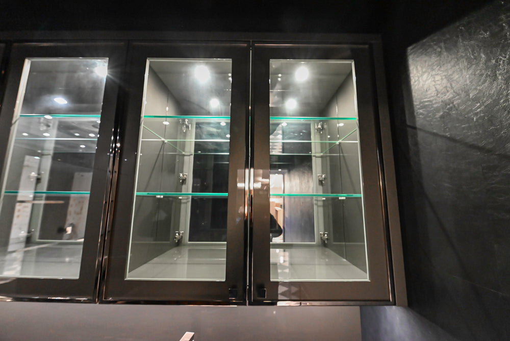Elevate your entertaining space with this St. Charles modern wet bar, combining high-gloss metallic veneer, polished nickel accents, and luxurious Blue Tiger Eye stone countertops. Designed to impress, this wet bar balances bold, contemporary style with practical functionality.
