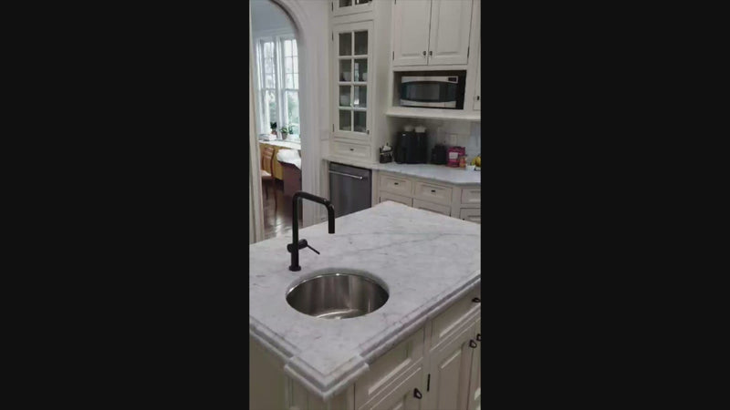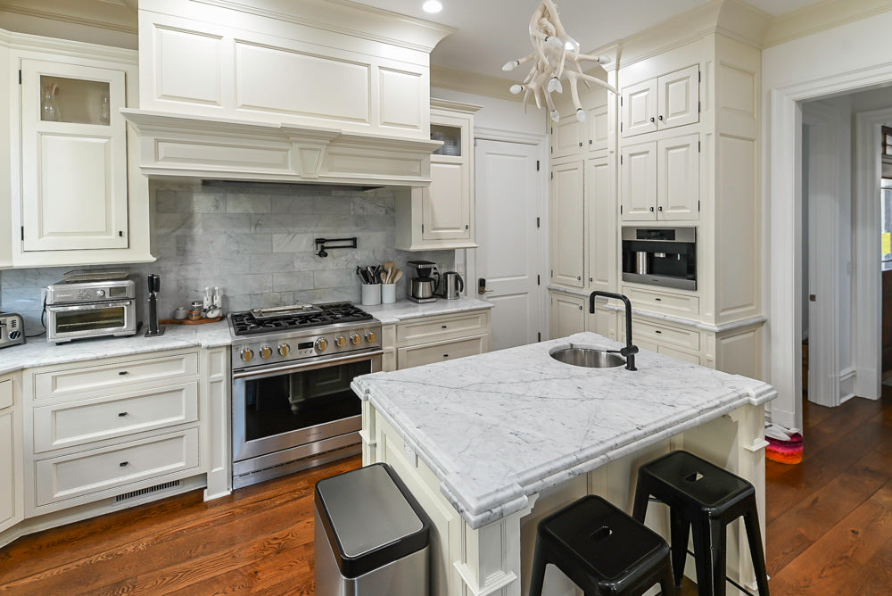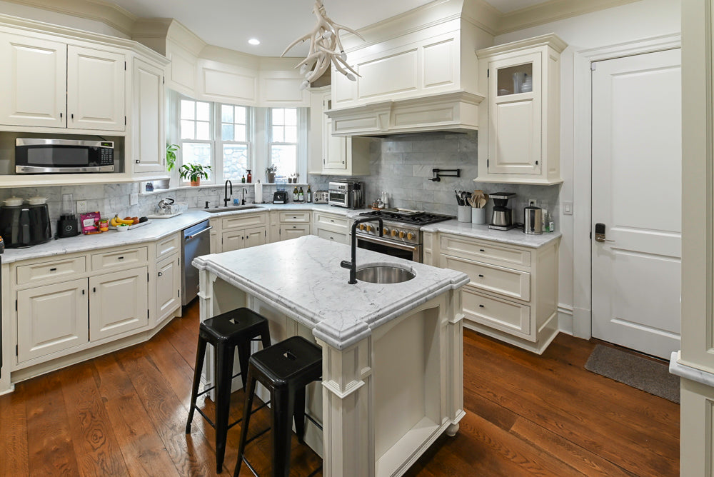 Soft white cabinetry brings warmth and elegance, while the marble countertops add a luxurious, natural touch. The central island provides ample space for prep, seating, and storage, making it a versatile centerpiece for everyday living and entertaining.