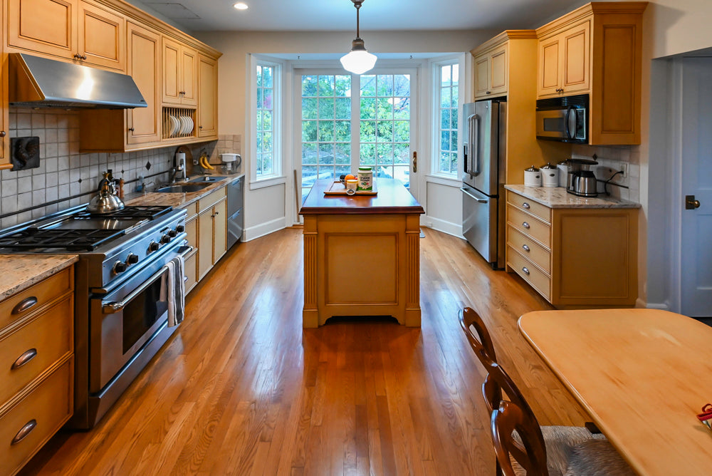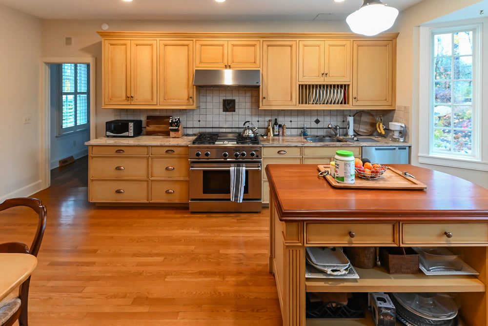 At the heart of this kitchen lies a spacious island, perfect for meal preparation, casual dining, or gathering with family and friends. The generous breakfast area offers a cozy spot for morning meals or evening conversations, enhancing the kitchen’s versatility and appeal.