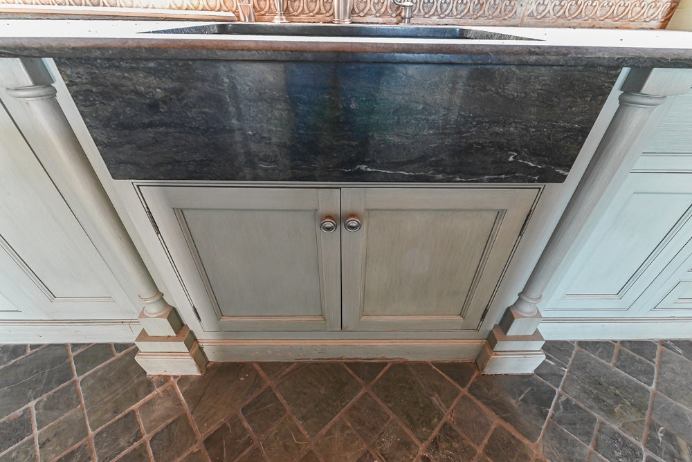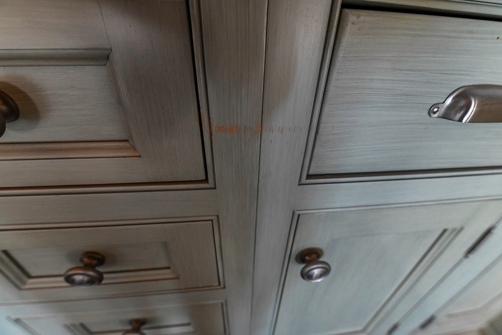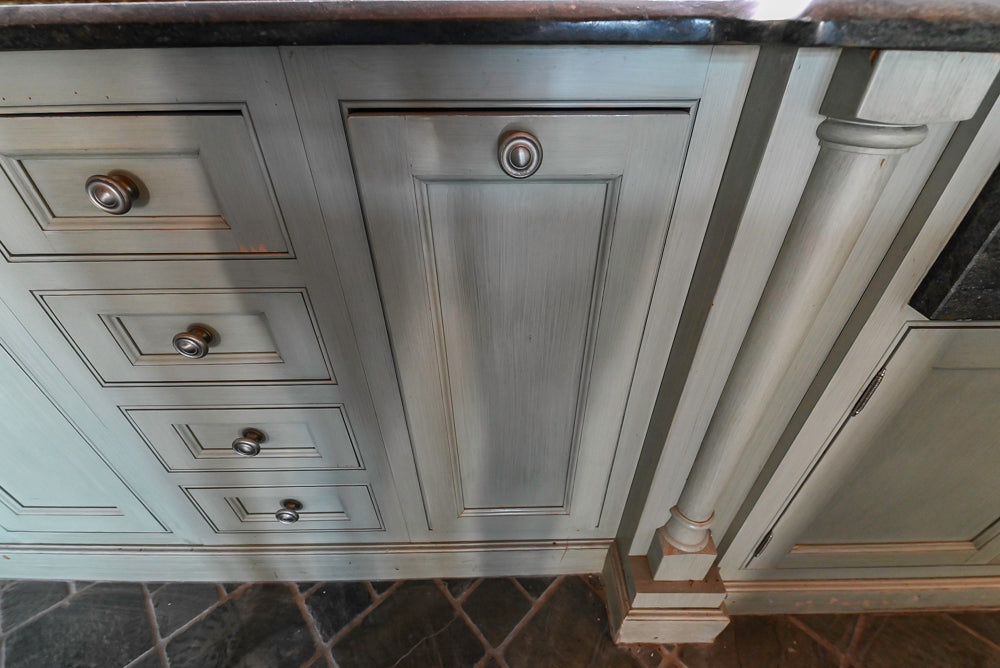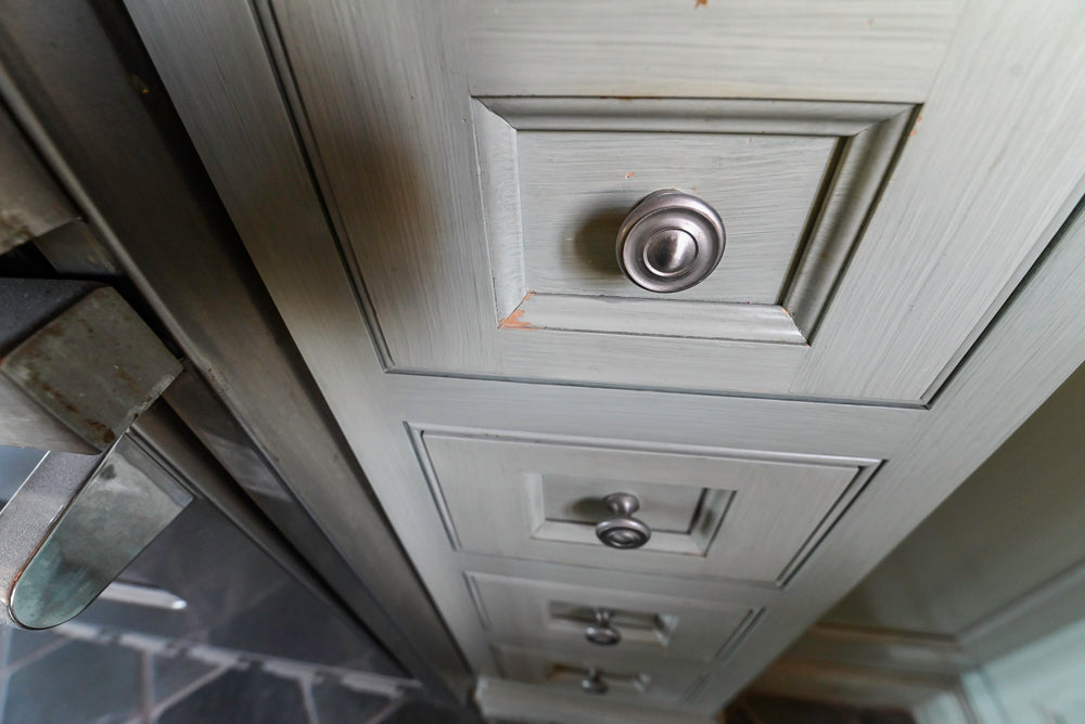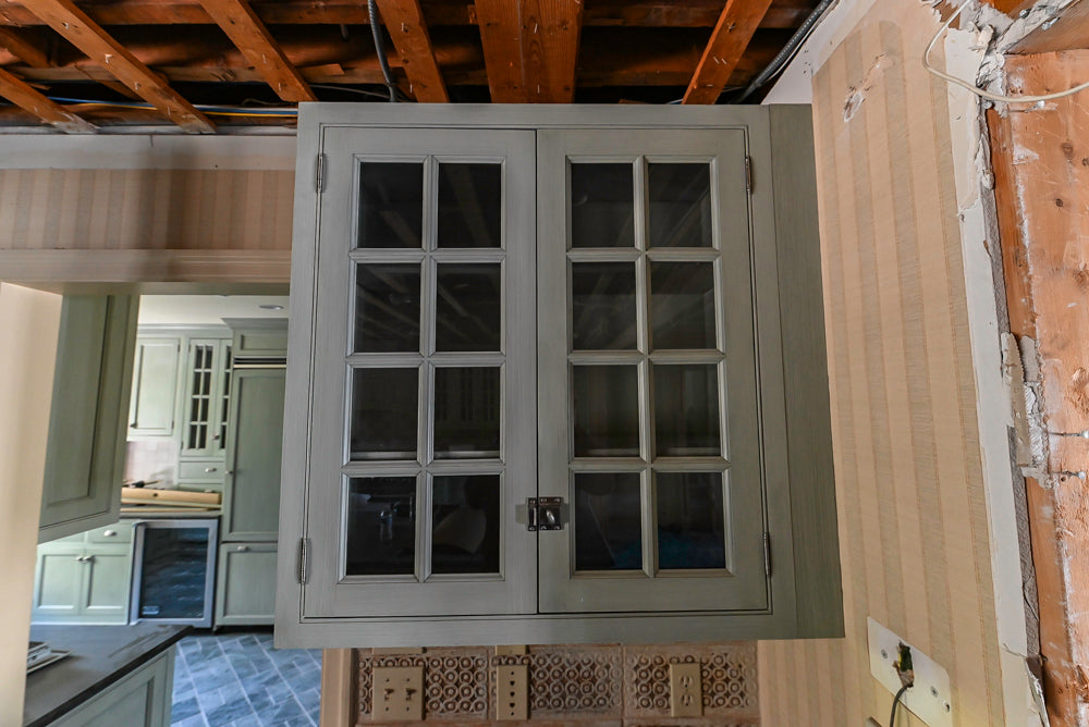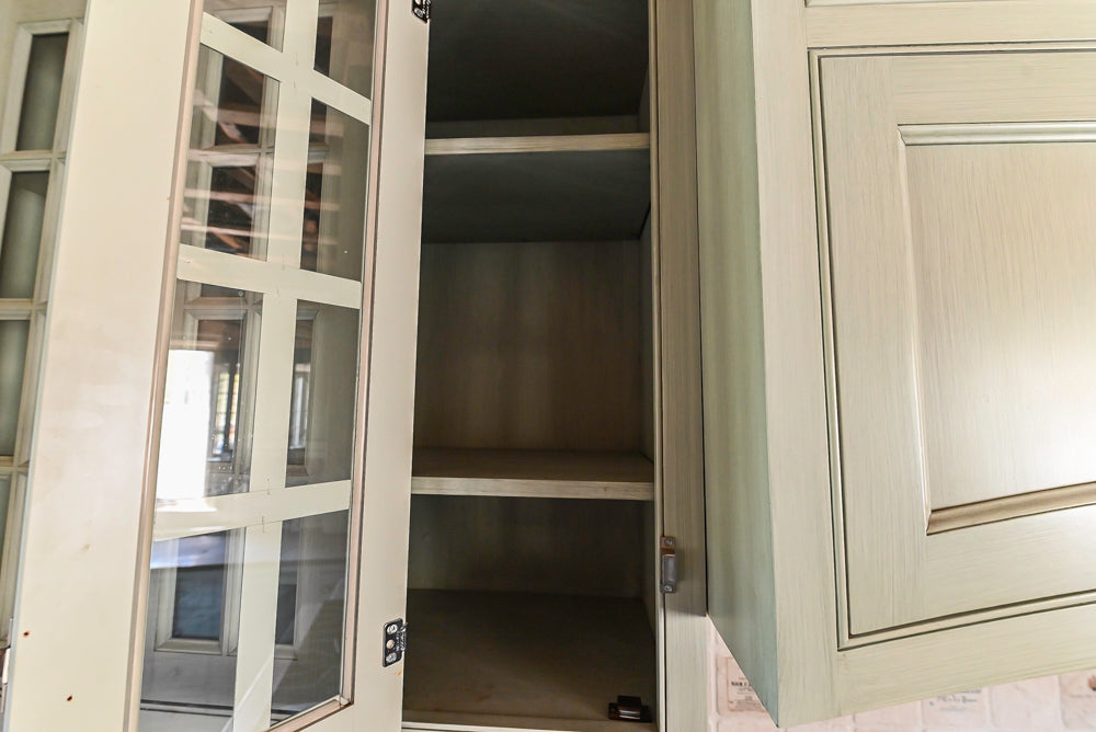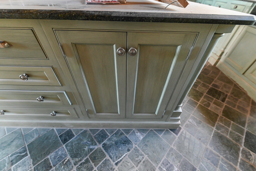 Bring vintage charm and classic craftsmanship to your home with this Traditional Washed Out Light Green Kitchen. The soft, muted green finish adds a warm and welcoming touch, while the spacious island offers added functionality and a natural gathering space.