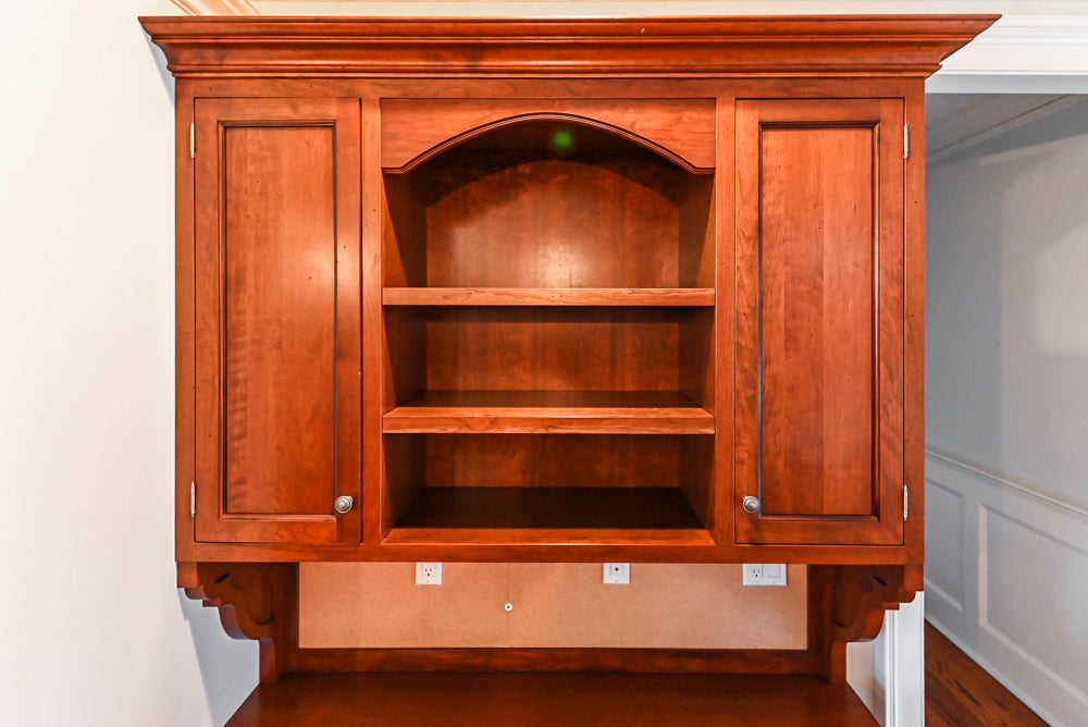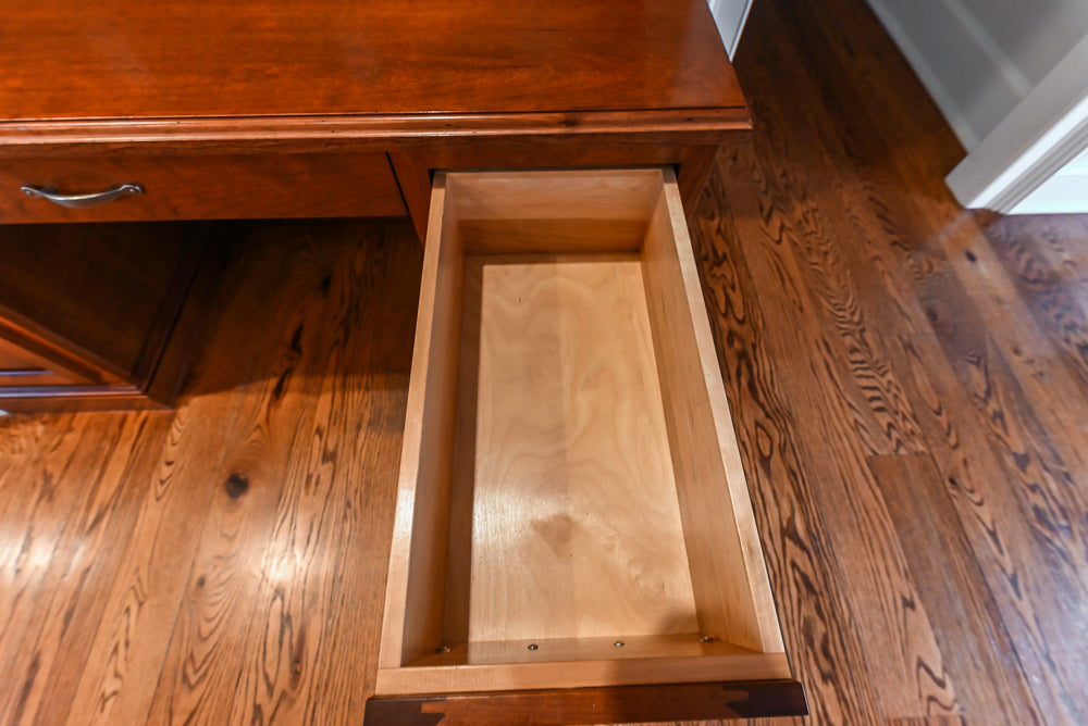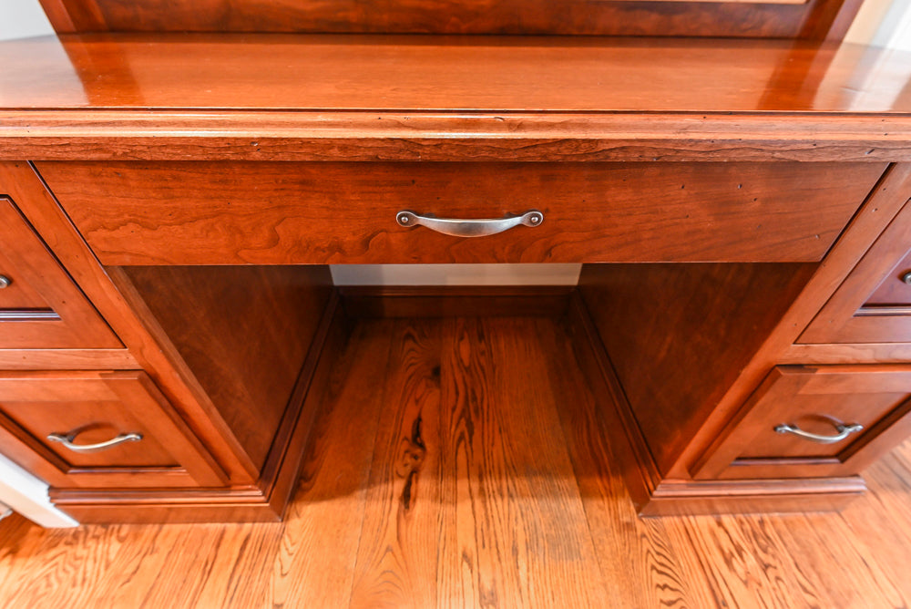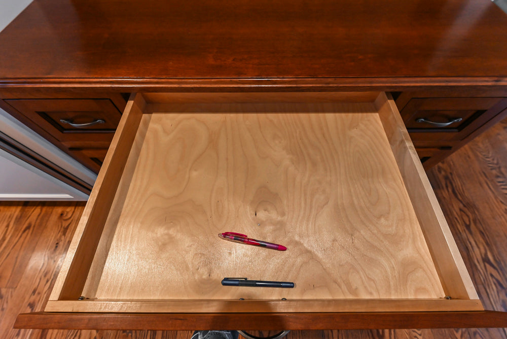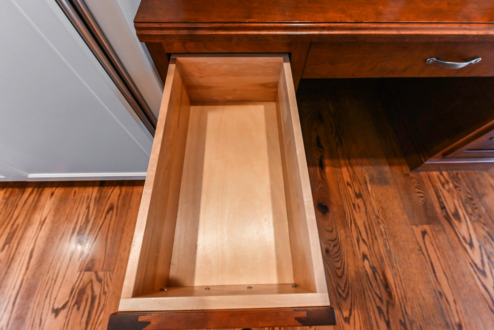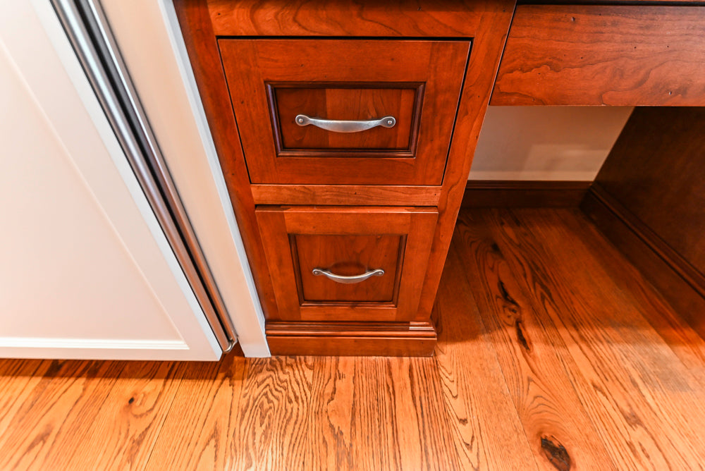 The thoughtfully integrated desk area provides a convenient workspace, ideal for managing household tasks, working from home, or keeping your kitchen organized.
