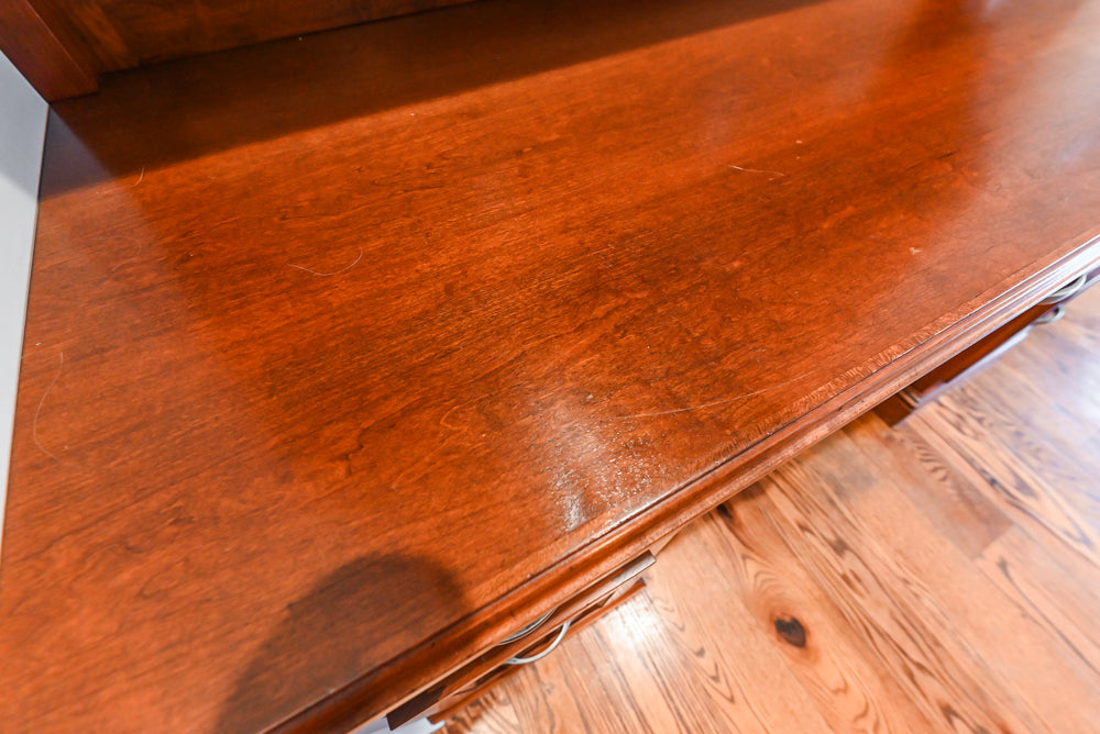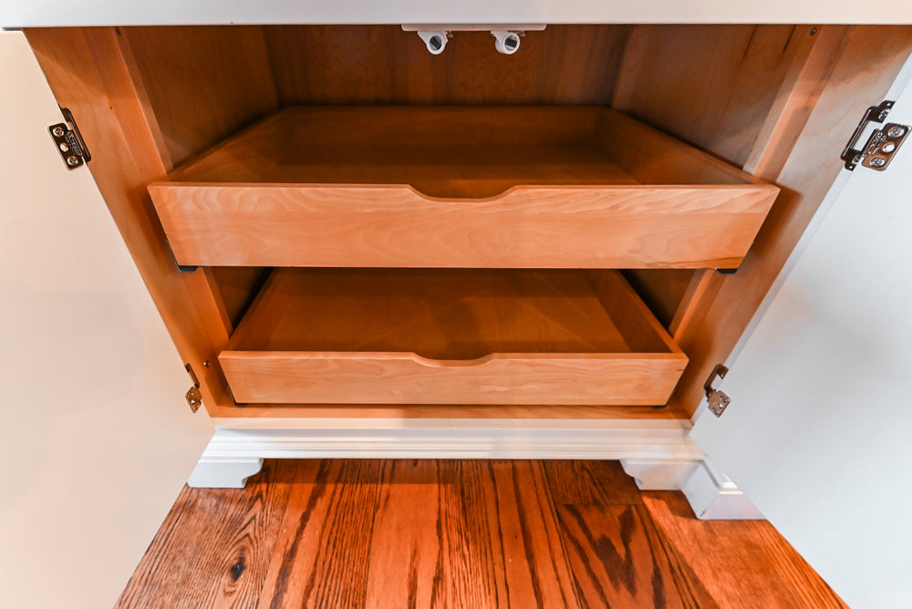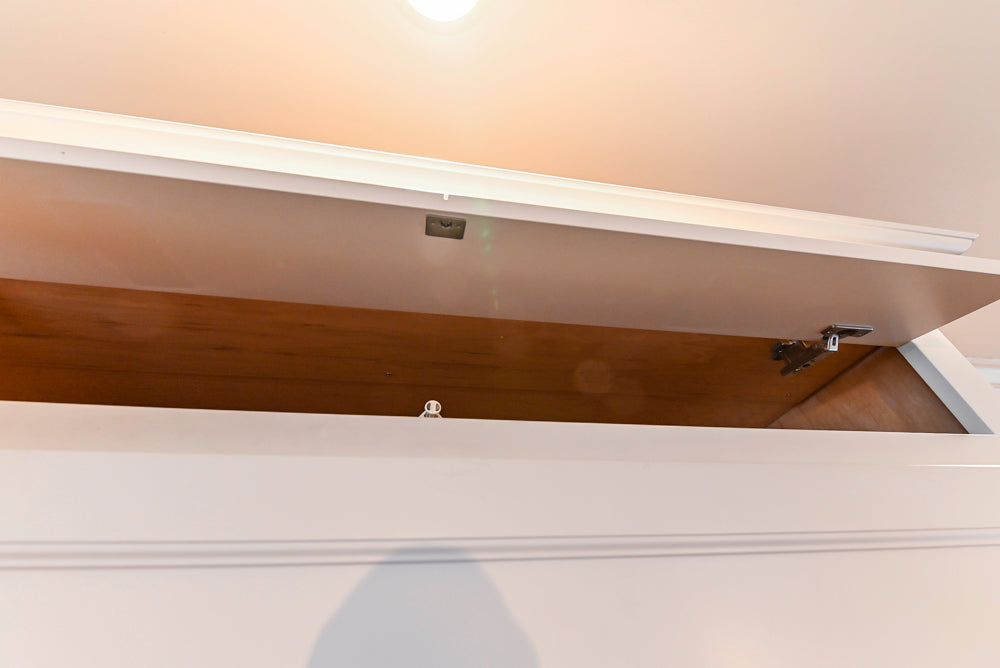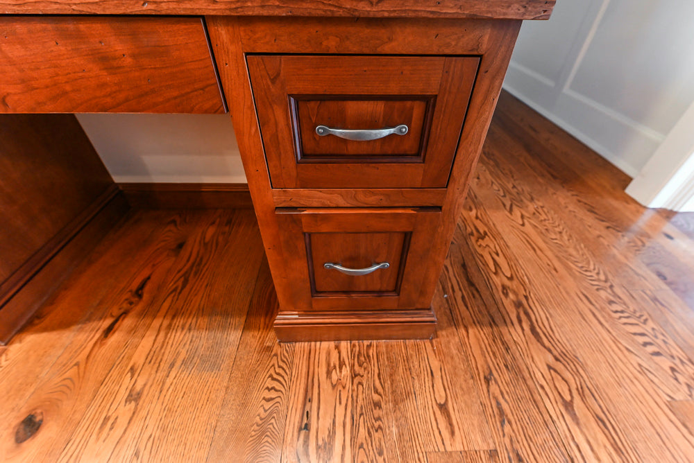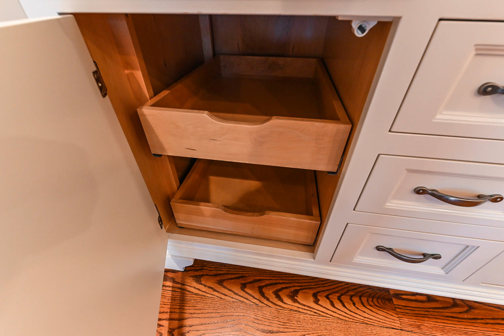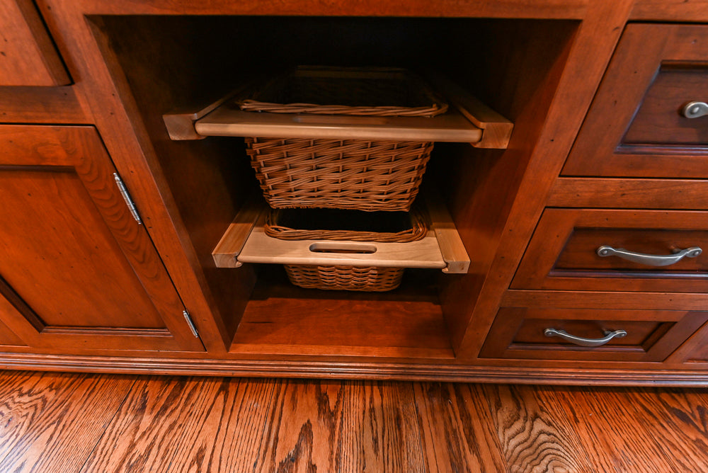 The thoughtfully integrated desk area provides a convenient workspace, ideal for managing household tasks, working from home, or keeping your kitchen organized.