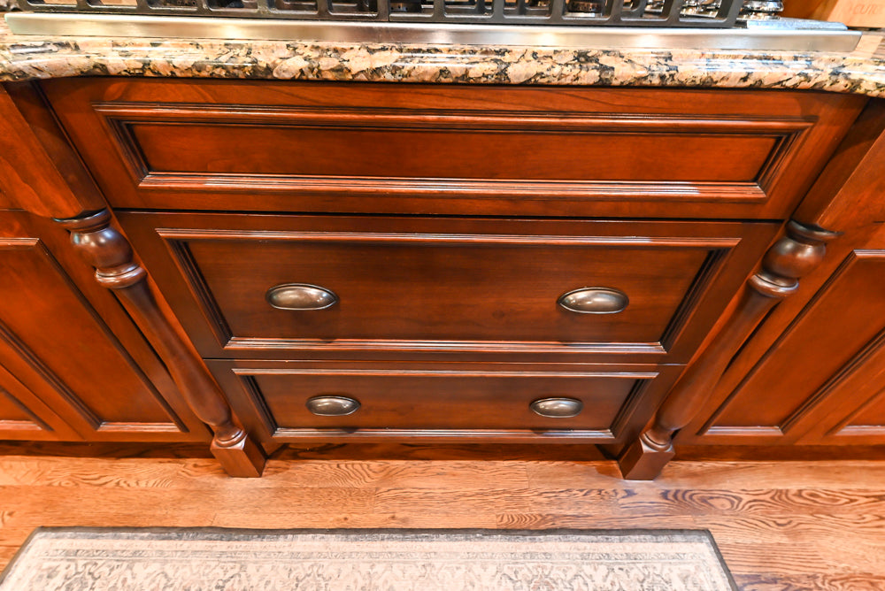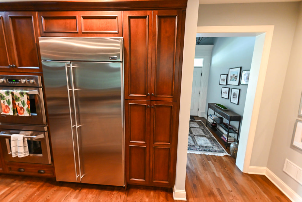 At the heart of the design is a spacious island, perfect for meal prep, casual dining, or entertaining guests. Paired with state-of-the-art appliances seamlessly integrated into the cabinetry, this kitchen is as practical as it is beautiful. Each element has been meticulously chosen to create a cohesive look that honors traditional craftsmanship while accommodating today’s lifestyle.