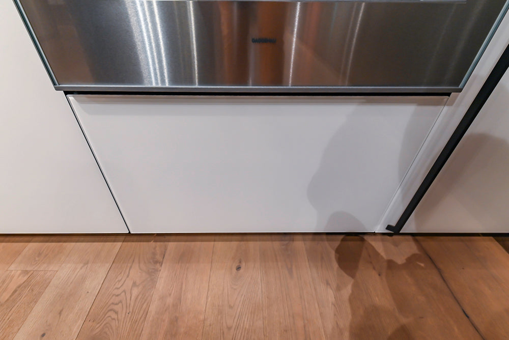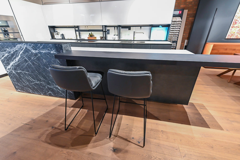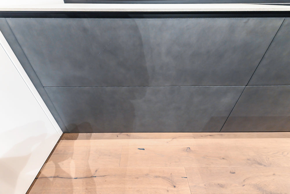 The glossy white glass continues around the corner with tall units housing the Gaggenau refrigerator, oven and steam oven along with pullout pantry storage. The base units are wrapped in Aretmatica Metal in a moody Titanium Zinc color. The island is punctuated with a marble-clad, floor standing Logica Theca unit which gives the kitchen even more hidden storage for knives and spices. The cantilevered wooden breakfast bar makes this kitchen an entertainer’s dream.