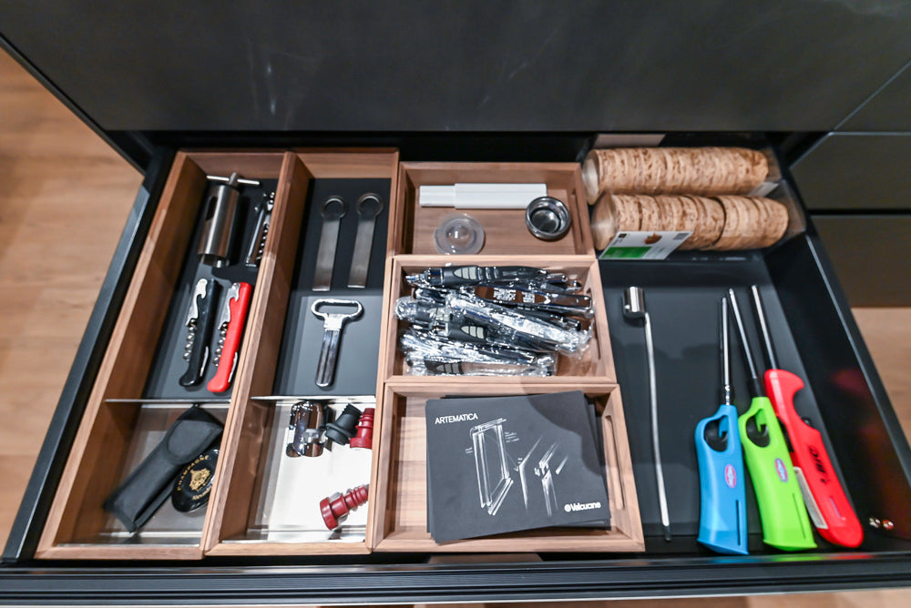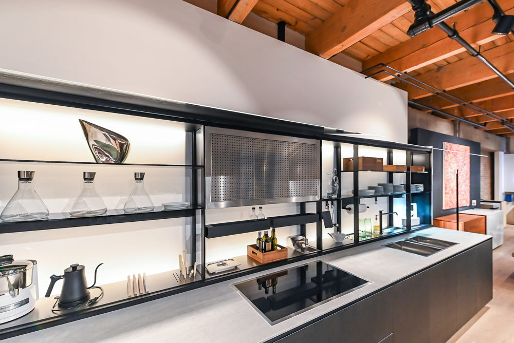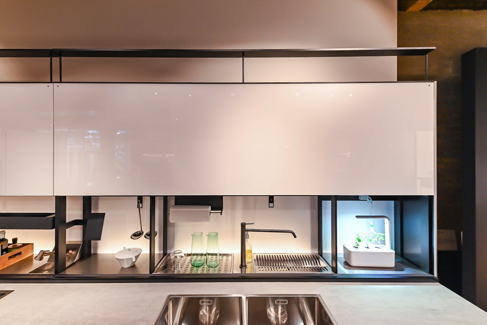 Beauty and function are perfectly combined in this kitchen which features a whole wall of Valcucine’s New Logica special element.Lower the white glass backsplash and lift the patented counterweighted upper door to reveal the perfect hidden workspace filled with functional accessories like rotating spice racks, plug strips for small appliances, a pot filler, integrated hood vent, utensil rails with paper towel holder, a tablet stand and drying rack. The back panel ofNew Logica is illuminated giving the kitchen a wonderful glow.