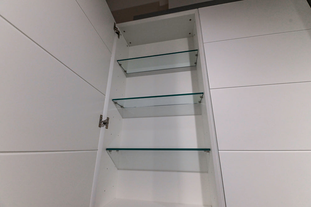 Elevate your bathroom with this White Modern Vanity Set featuring sleek double sinks, included faucets, and a matching wardrobe closet system for a complete and cohesive design. With its crisp white finish and minimalist lines, this set adds a contemporary touch while maximizing storage and functionality.